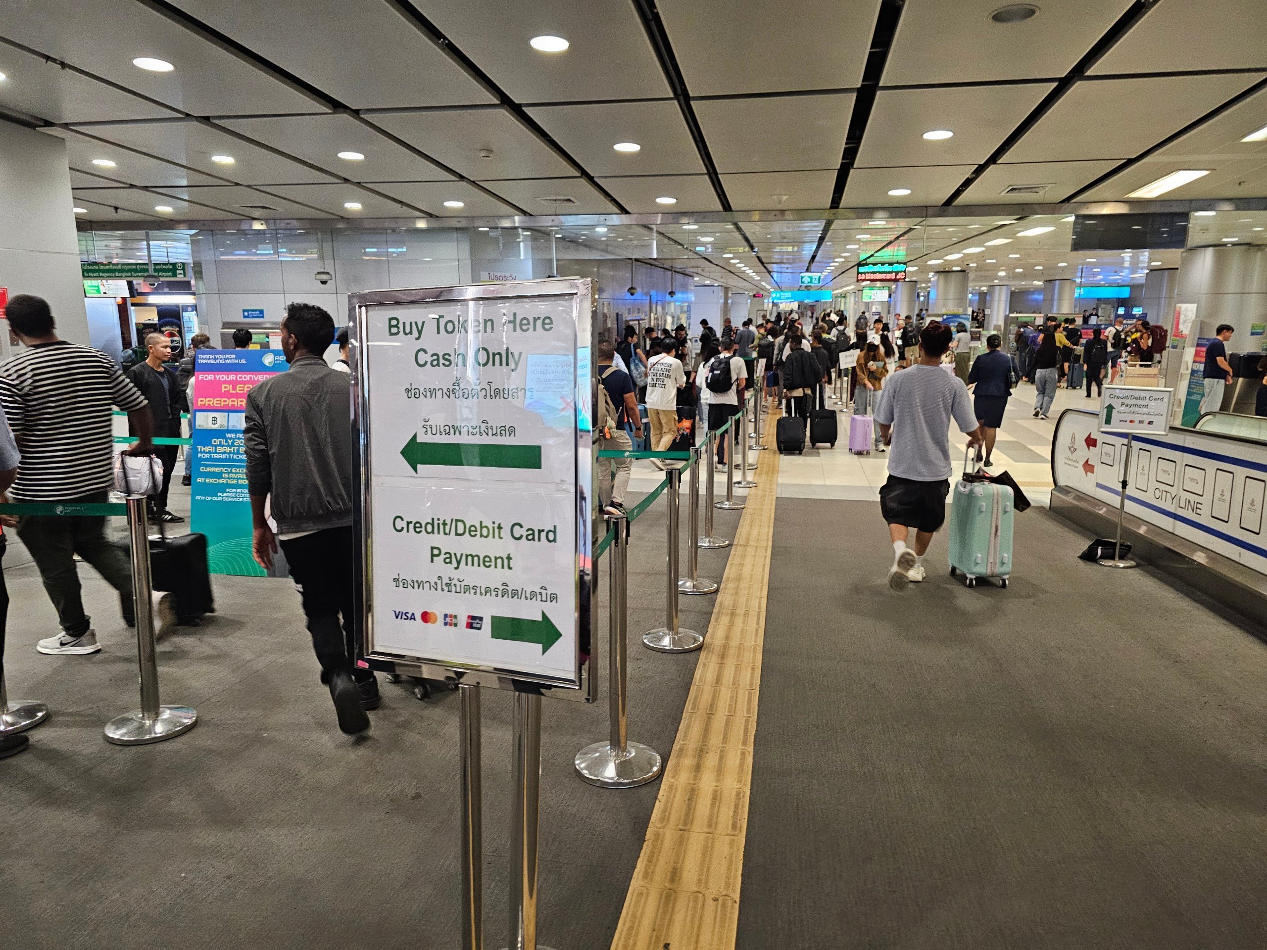 È possibile utilizzare solo contanti (la macchina accetta banconote fino a 100 thb). Vi viene dato un gettone di plastica che dovete "suonare" al tornello (il gettone ha un chip al suo interno) e lasciarlo cadere nel tornello quando scendete.