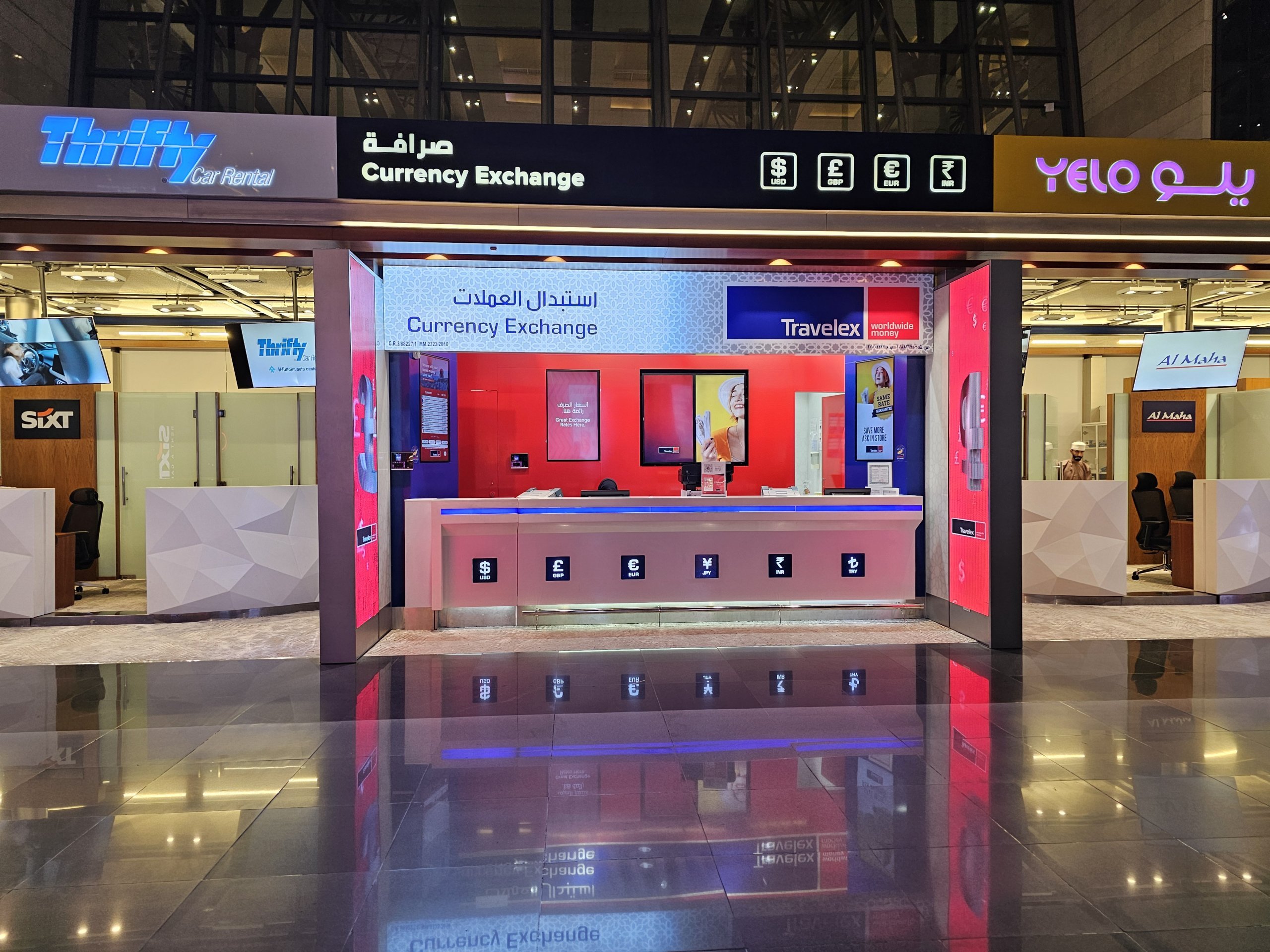 Gli uffici di cambio in aeroporto sono gestiti da Travelex e Global Money Exchange, con tariffe poco vantaggiose.