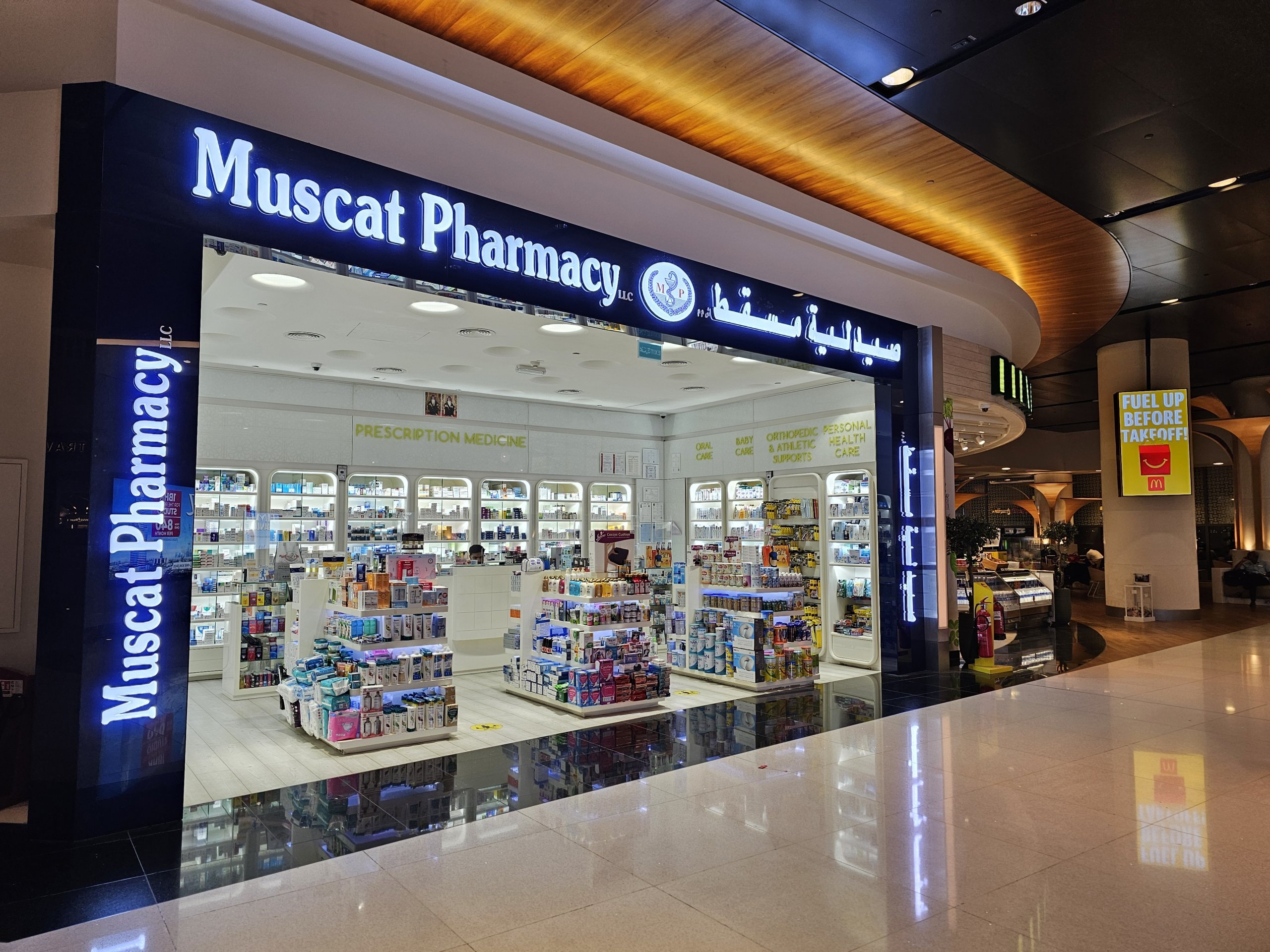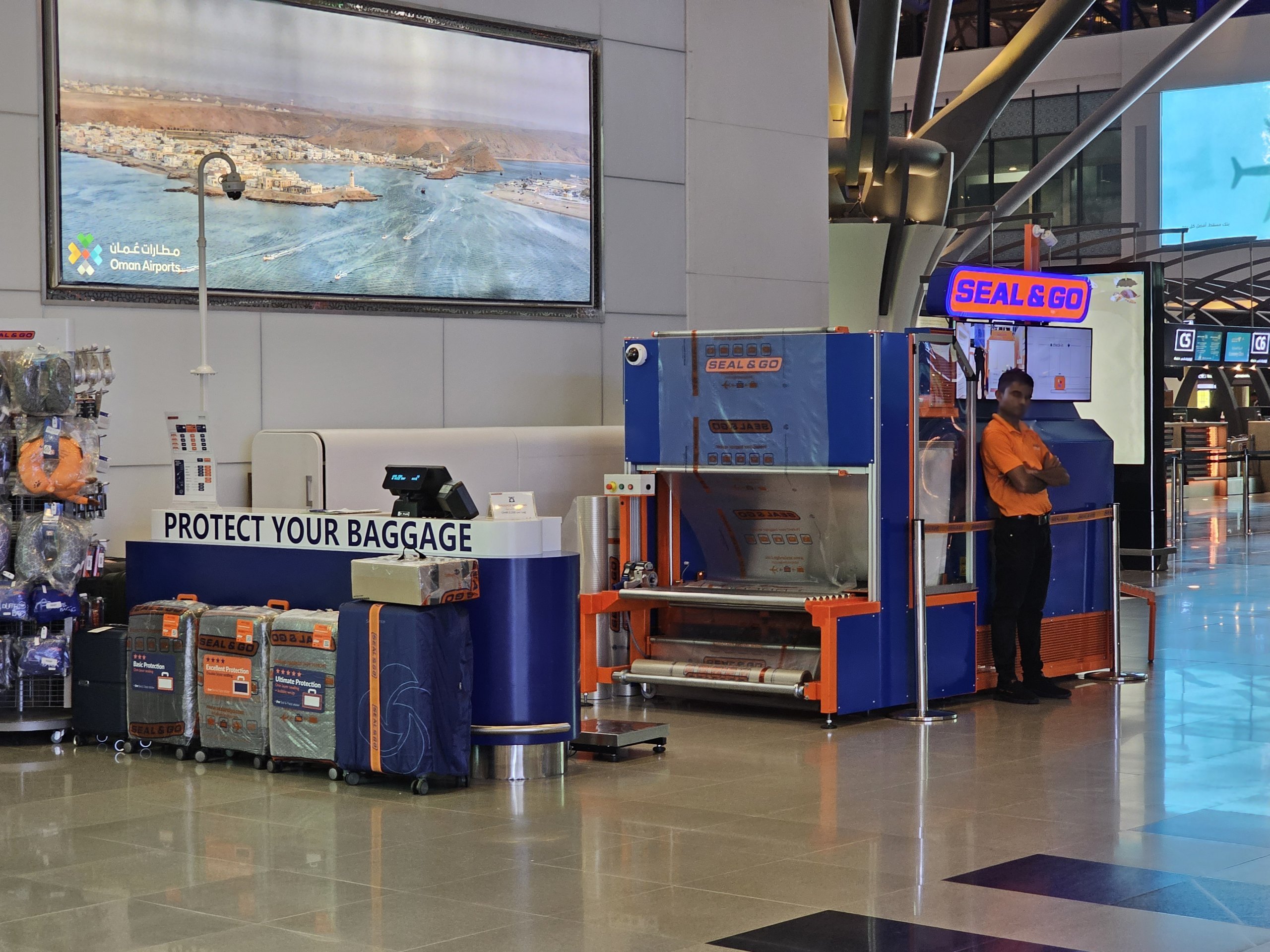 Nella hall delle partenze ci sono diversi chioschi in cui è possibile far avvolgere il proprio bagaglio in una pellicola protettiva per un costo che varia da 3 omr a 6 omr (a seconda delle dimensioni della valigia).