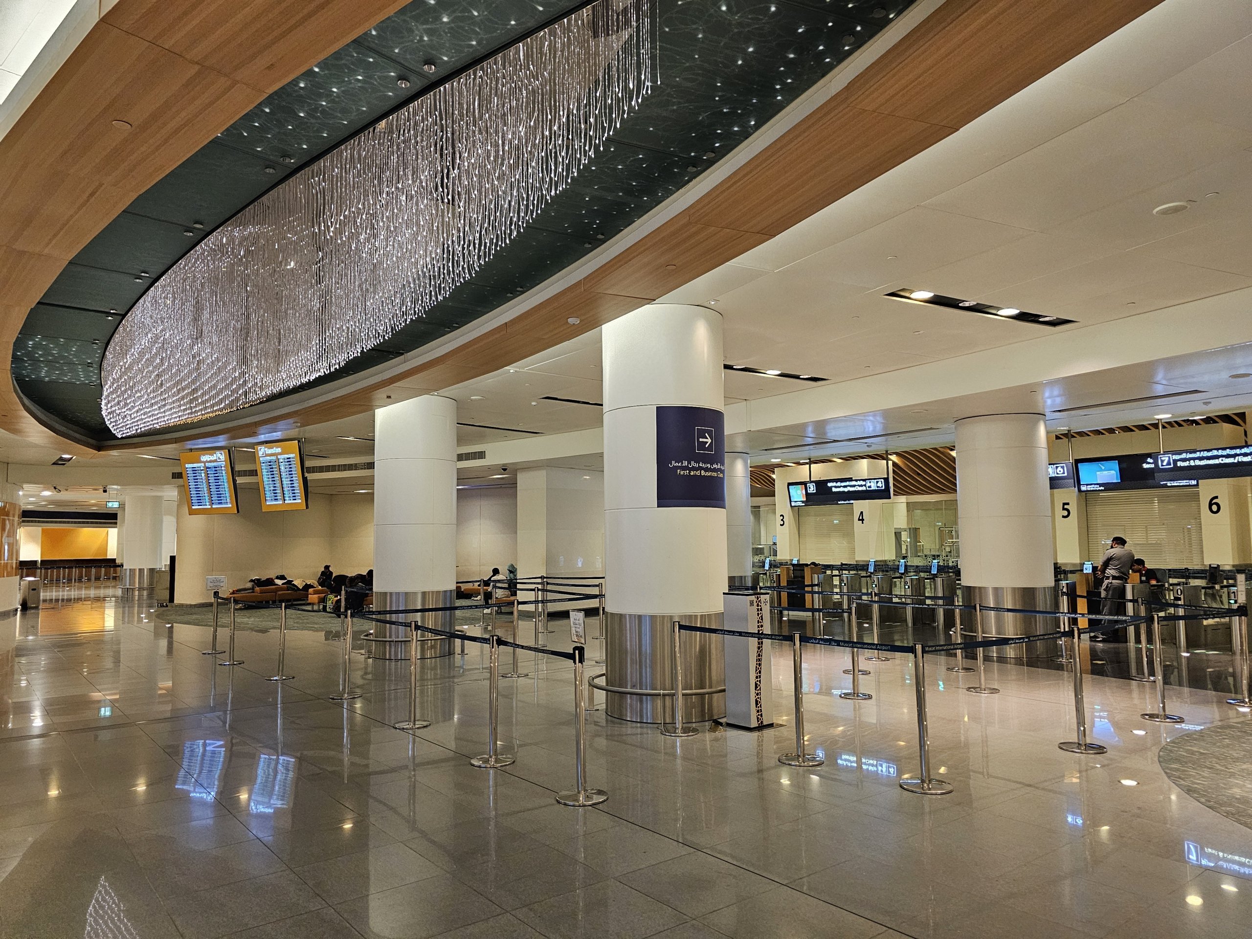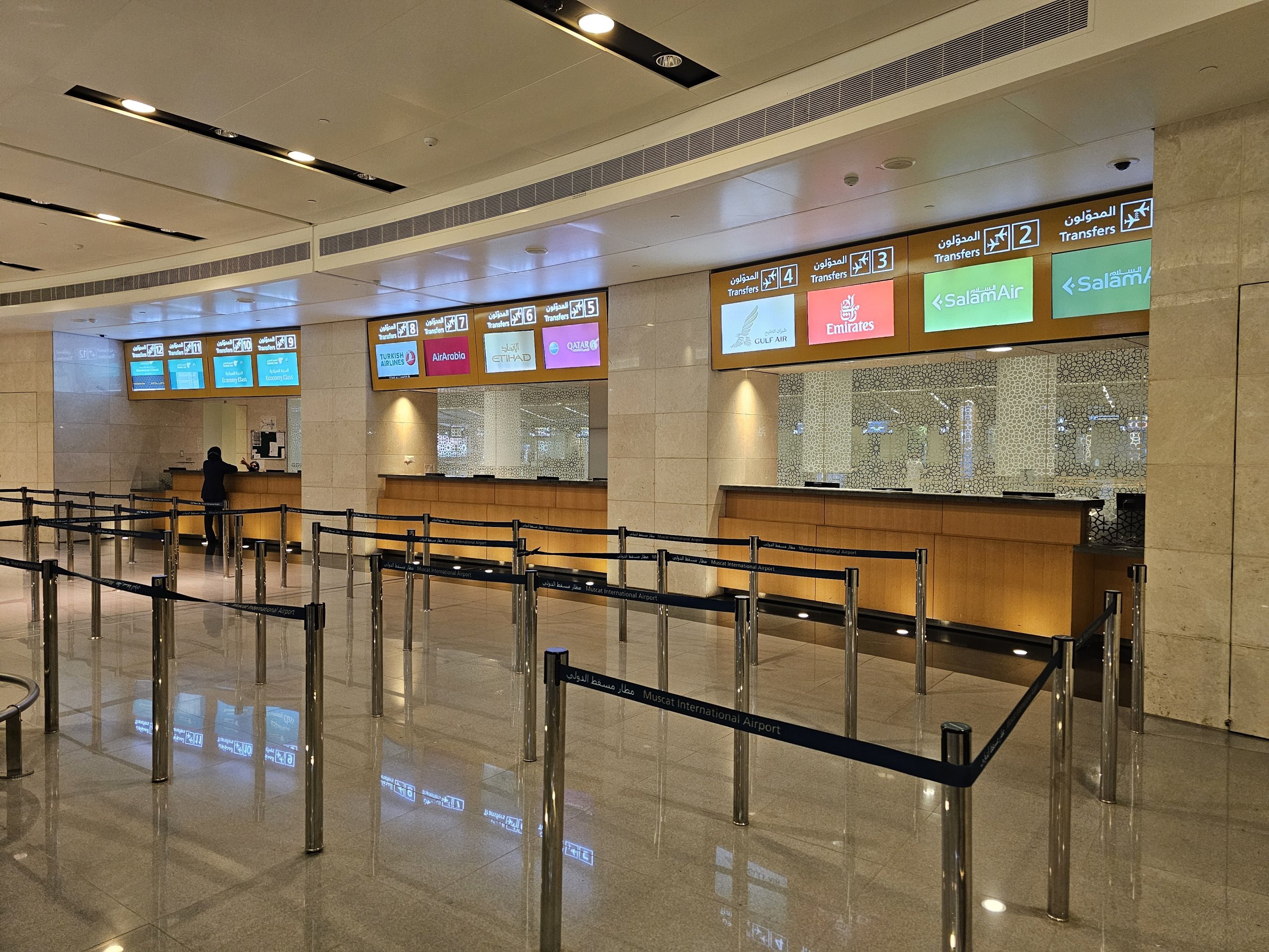 Muscat dispone di un solo grande e moderno terminal, ma non è neanche lontanamente paragonabile alle dimensioni di altri aeroporti della regione, come Dubai, Riyadh, Jeddah o Doha.