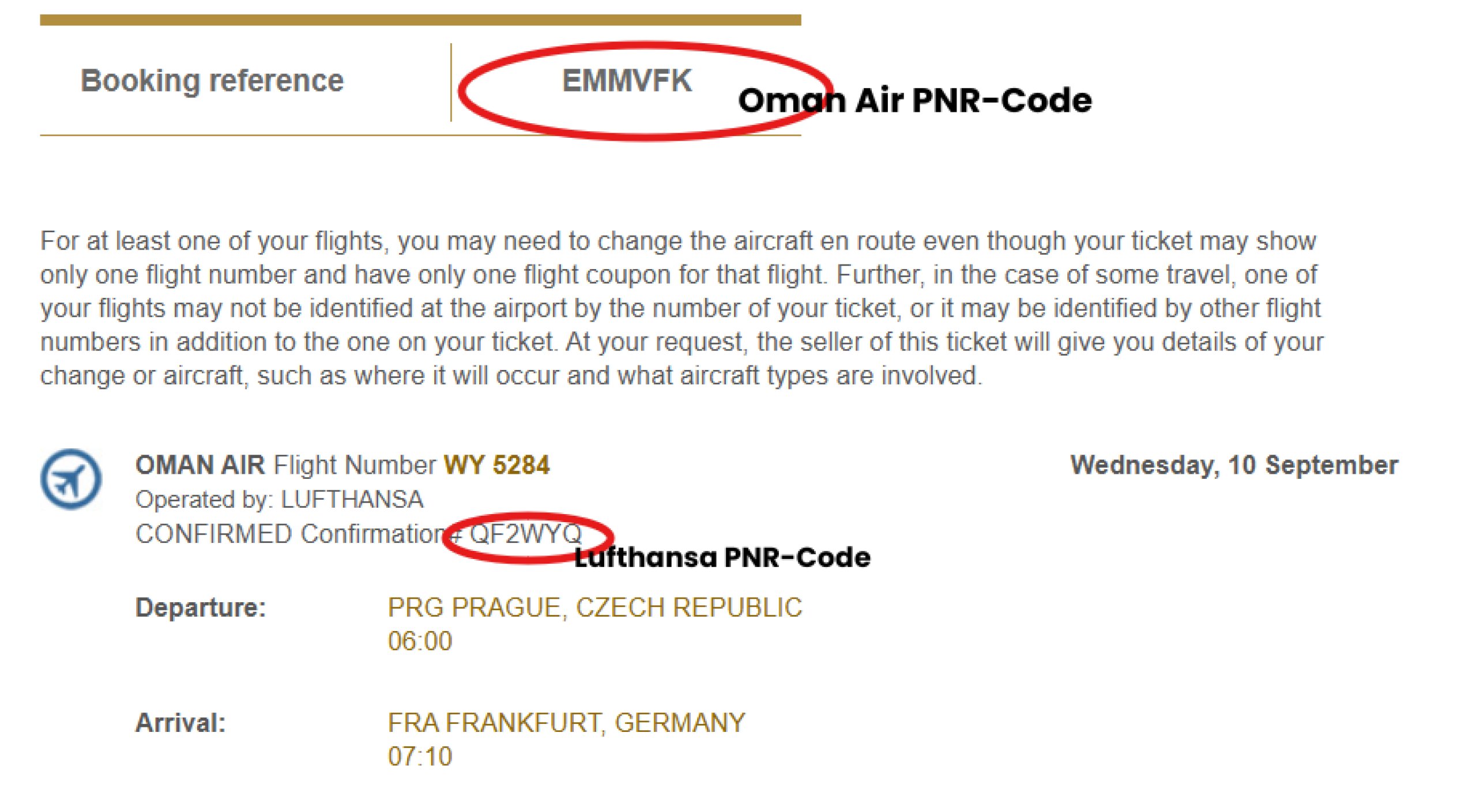 Tutti i voli sono stati acquistati come un'unica prenotazione, ma il volo Lufthansa da Praga a Francoforte aveva un codice PNR diverso da quello del volo Oman Air da Francoforte FRA via Muscat MCT a Zanzibar ZNZ.