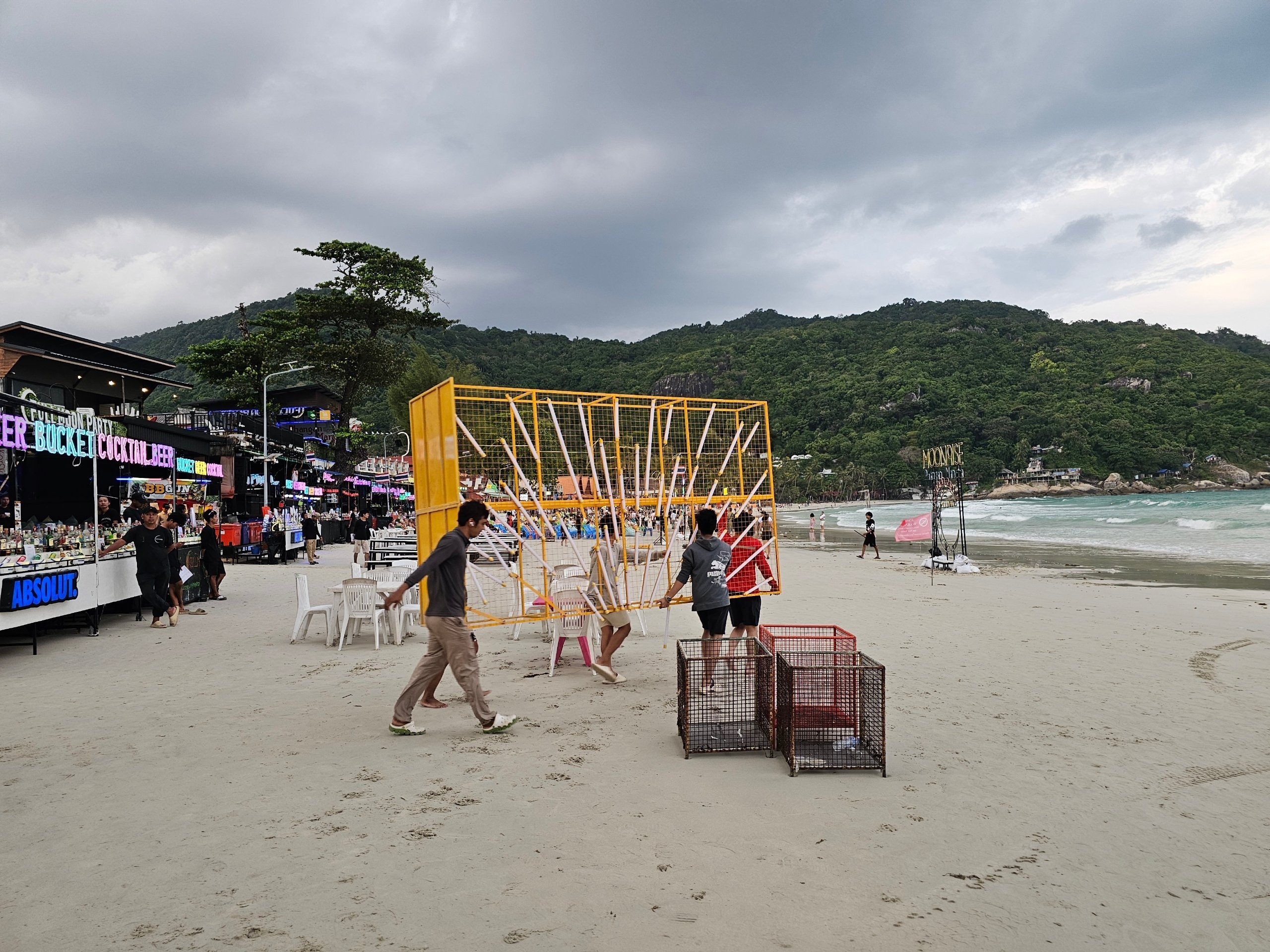 La nostra prima visita alla spiaggia di Haad Rin è avvenuta nel pomeriggio, quando i preparativi erano ancora in corso.