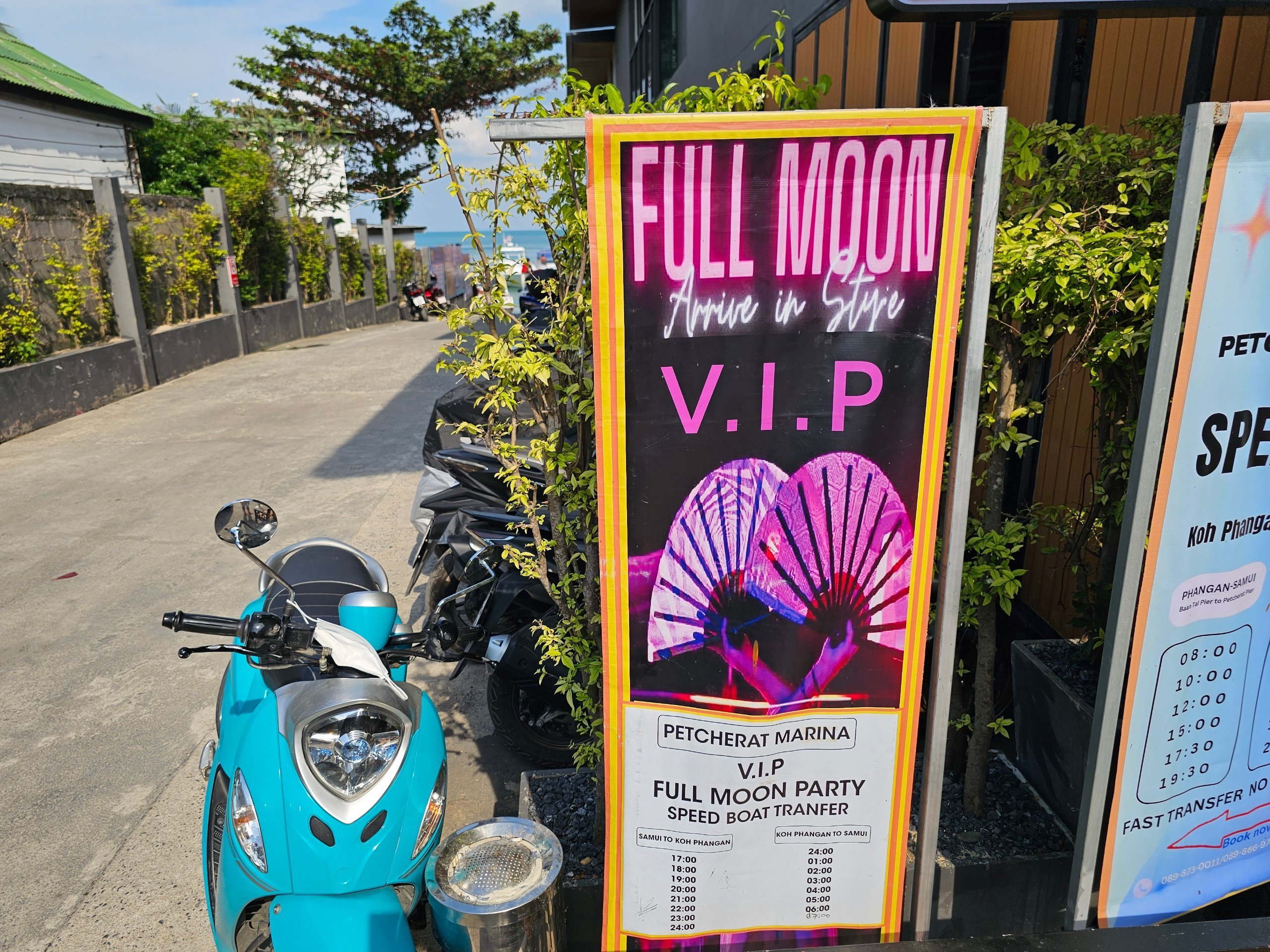 Questa è l'opzione migliore. Con uno scooter si può sempre parcheggiare da qualche parte e anche il parcheggio per le auto è abbondante nel centro di Haad Rin (a 15 minuti a piedi dalla spiaggia).