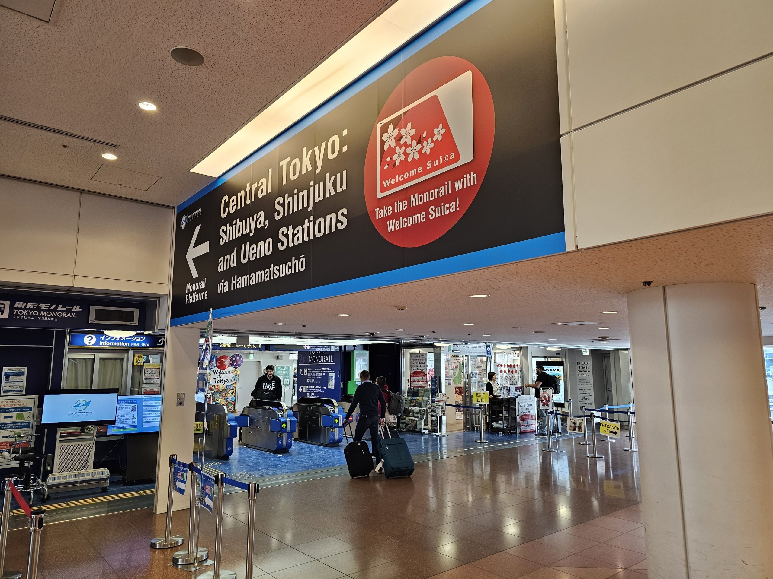 - presso i distributori automatici all'esterno della piattaforma della monorotaia (non presso i distributori automatici sui treni Keikyu, ma la Suica può essere utilizzata successivamente su questi treni)