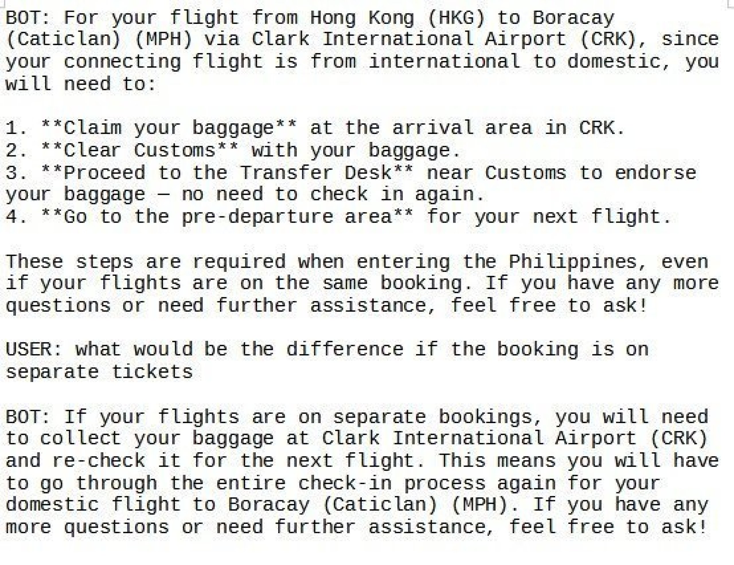 Ciao, ho chiesto qualcosa di simile sulla chat, io volerò a febbraio. I miei voli sono su un'unica prenotazione e per evitare Manila volerò via Clark con uno scalo di 3 ore. Farò il check-in online. Ho salvato la trascrizione della chat con il BOT, in allegato.
