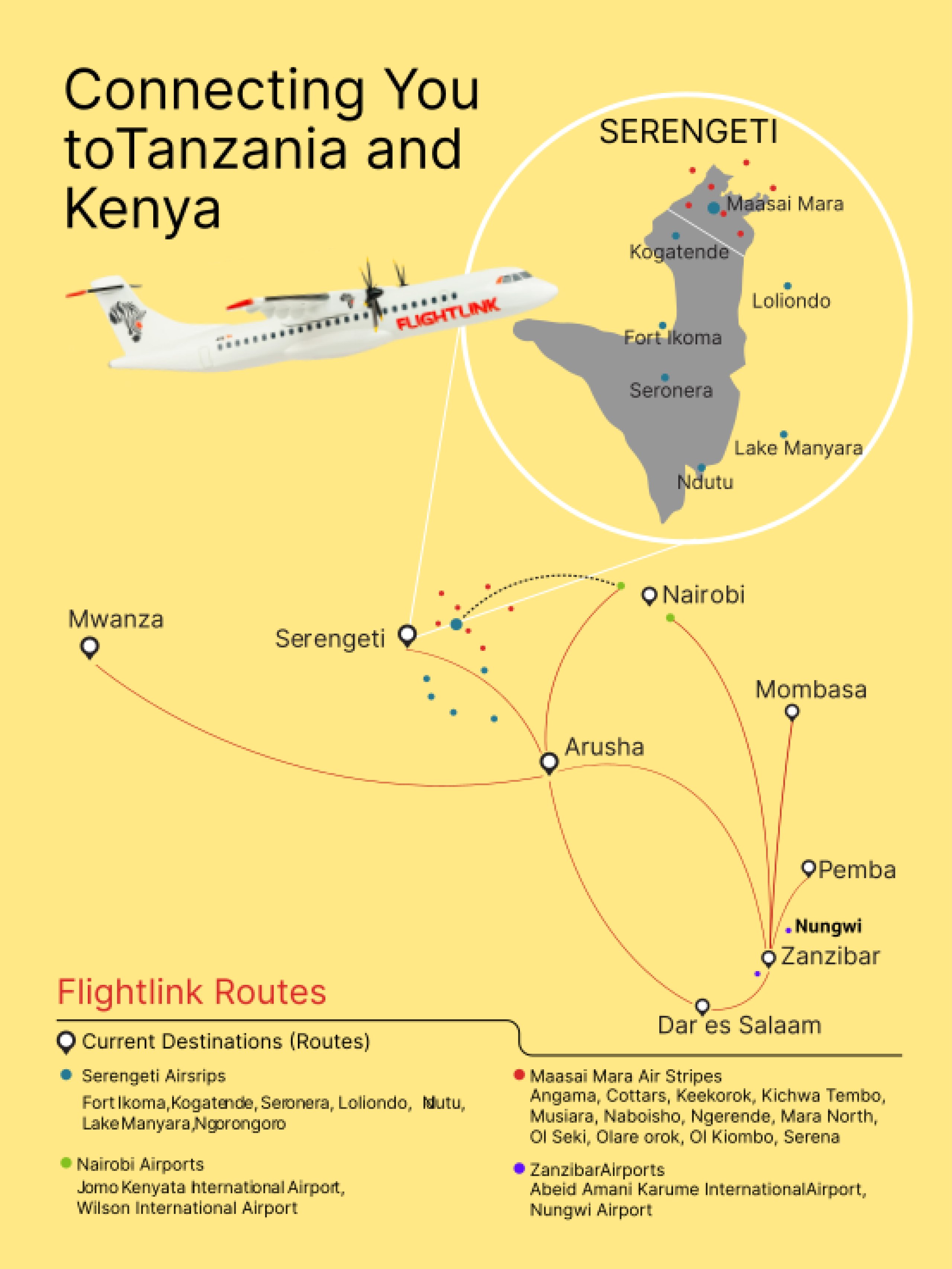 Flighlink si concentra sul collegamento delle principali destinazioni turistiche della Tanzania con la città più grande , Dar es Salaam.
