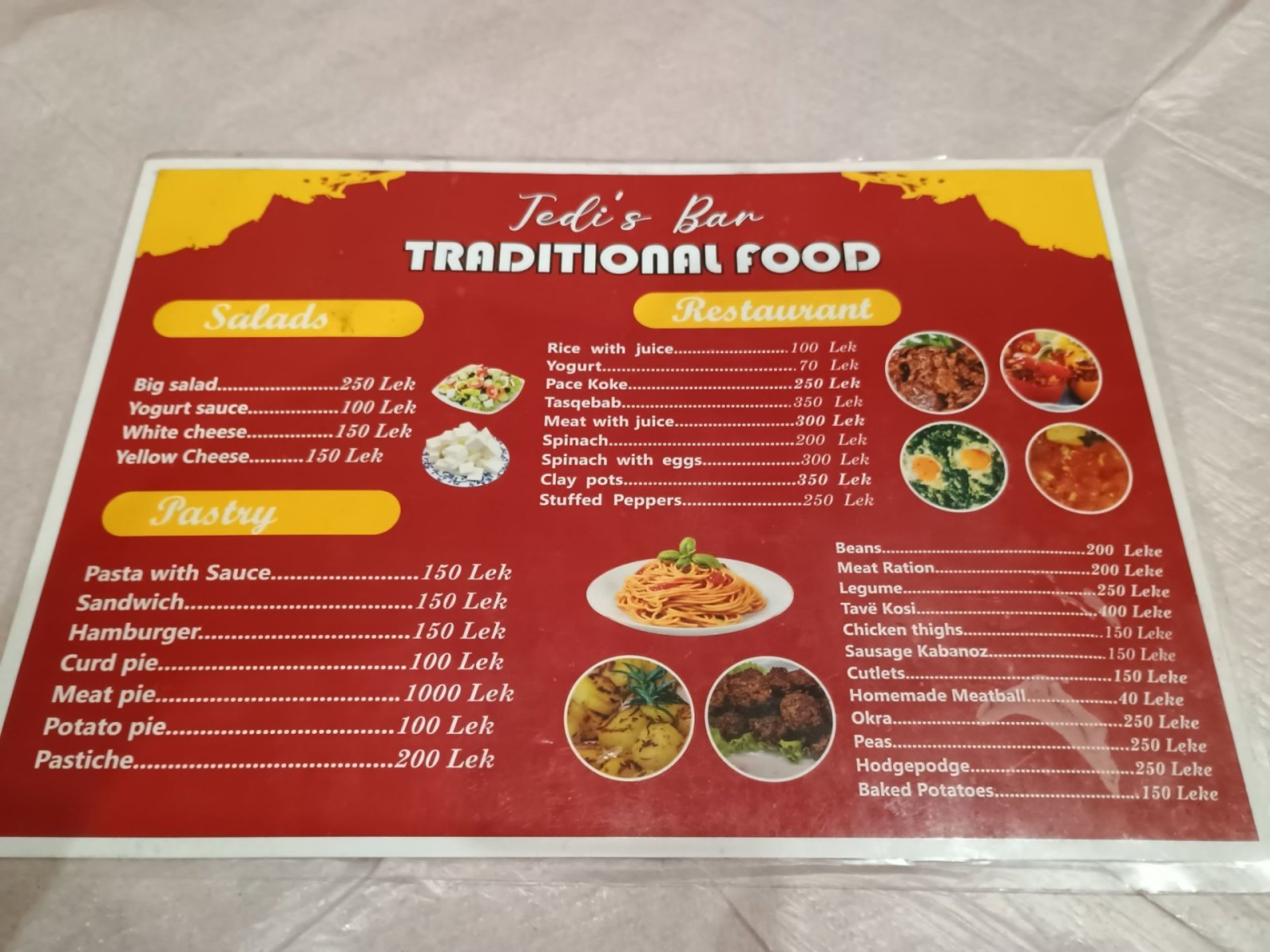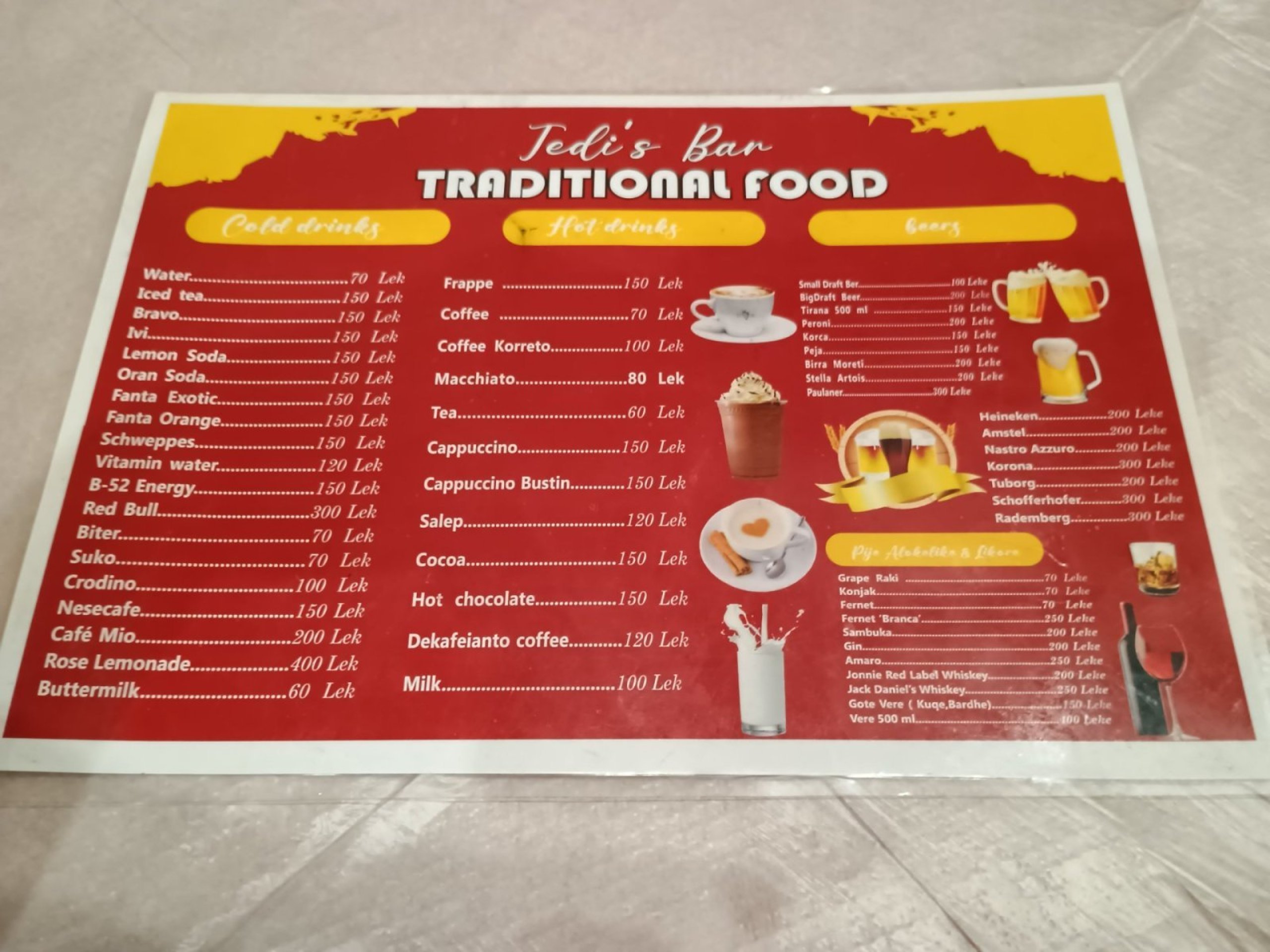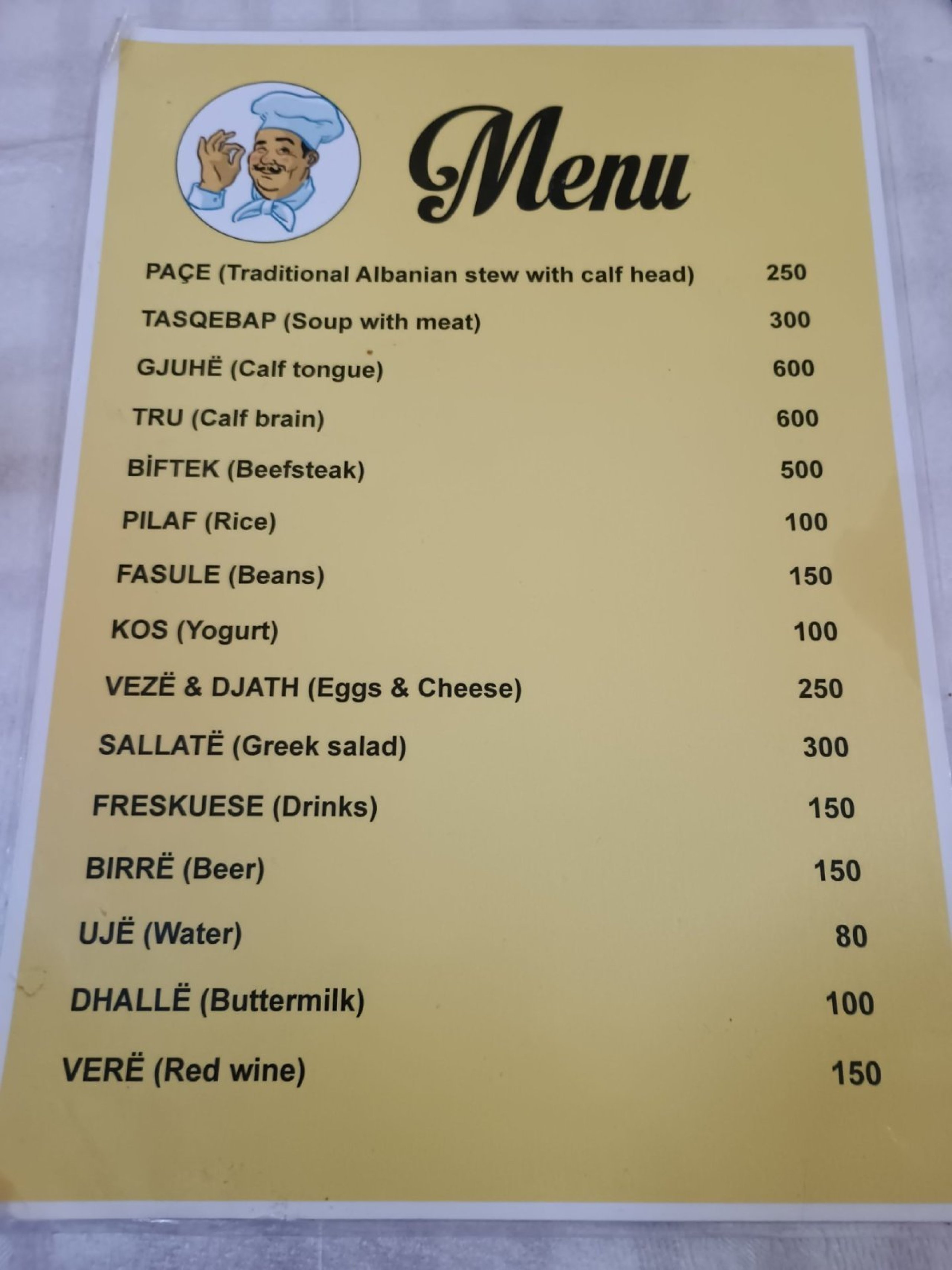 Ho allegato il menu di un normale ristorante albanese non turistico vicino alla stazione degli autobus di Drača e al mercato di Tirana: c'è una bella differenza rispetto ai prezzi dei ristoranti nei luoghi turistici.