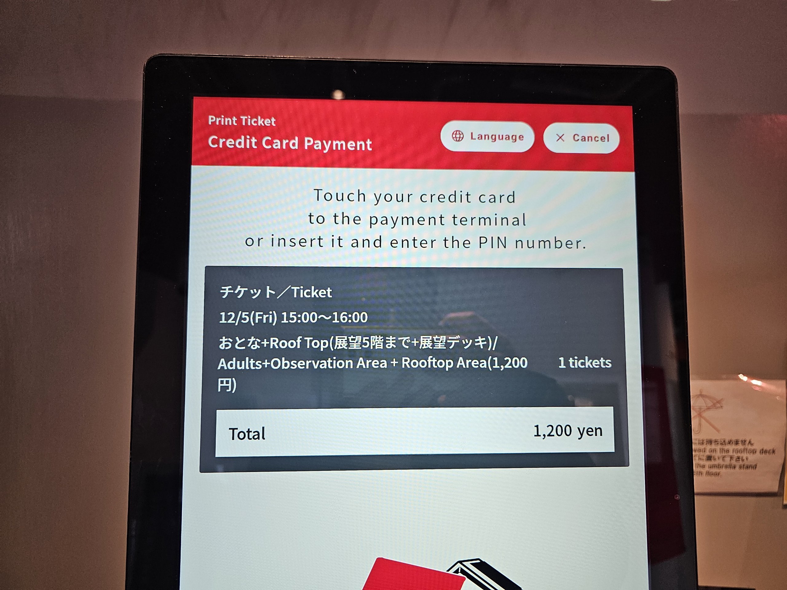 I biglietti possono essere acquistati alla biglietteria automatica con carta di credito o carta IC giapponese. Non si accettano contanti.