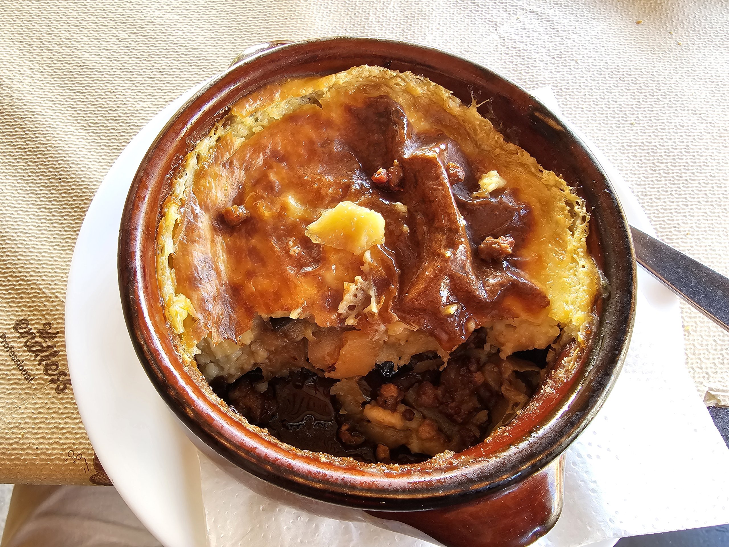 Musaka - uno dei piatti greci più famosi, spesso chiamato "lasagne balcaniche". Si tratta di diversi strati di melanzane cotte al forno (raramente una ciotola di melanzane zucchine) intervallati da carne di agnello e conditi con una salsa di besciamella.