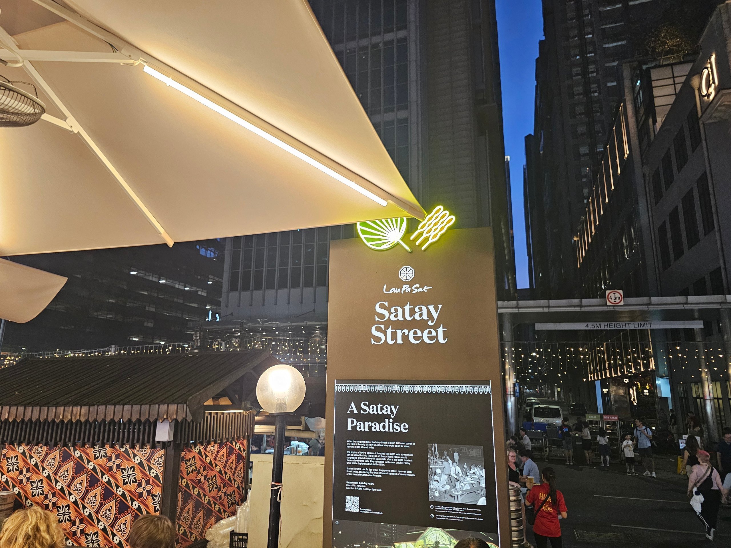 Ma la sera l'atmosfera cambia completamente: la strada di fronte all'edificio si chiude, dando vita alla famosa Satay Street, dove decine di spiedini vengono grigliati e l'intero luogo assomiglia a un grande festival di street-food all'aperto.