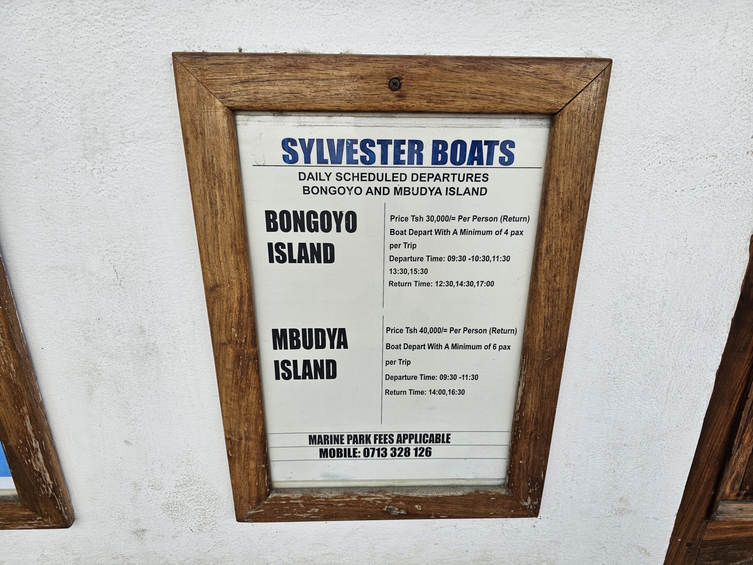 - Prezzo - biglietto di andata e ritorno 30 000 tz + ingresso alla Riserva Naturale di Bongoyo 50 000 tz