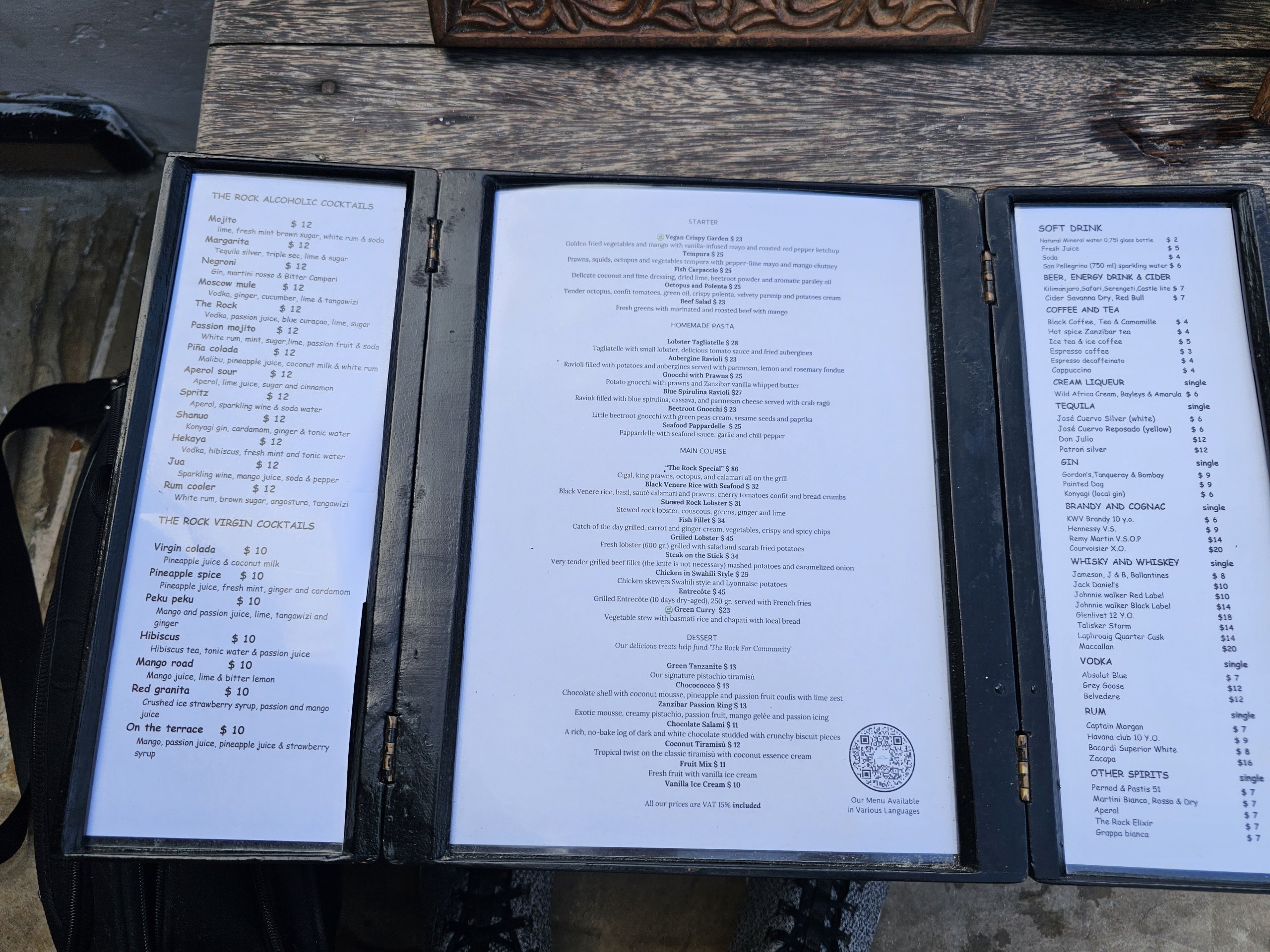Il menu completo può essere consultato sul sito web del ristorante: therockrestaurantzanzibar.com.
