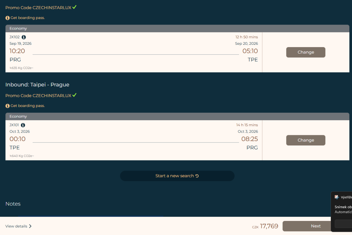 Taipei - Praga: 00:10-07:50