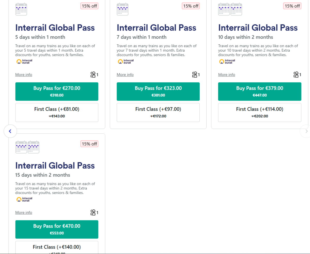 Lo sconto del 15% si applica a tutti i tipi di pass, che potete confrontare su thetrainline.com. Personalmente, mi interessavano soprattutto le seguenti offerte: