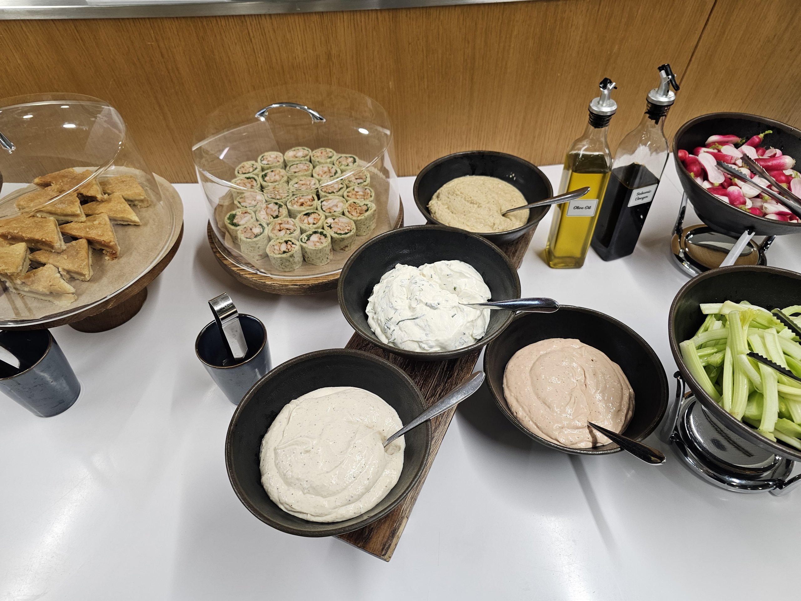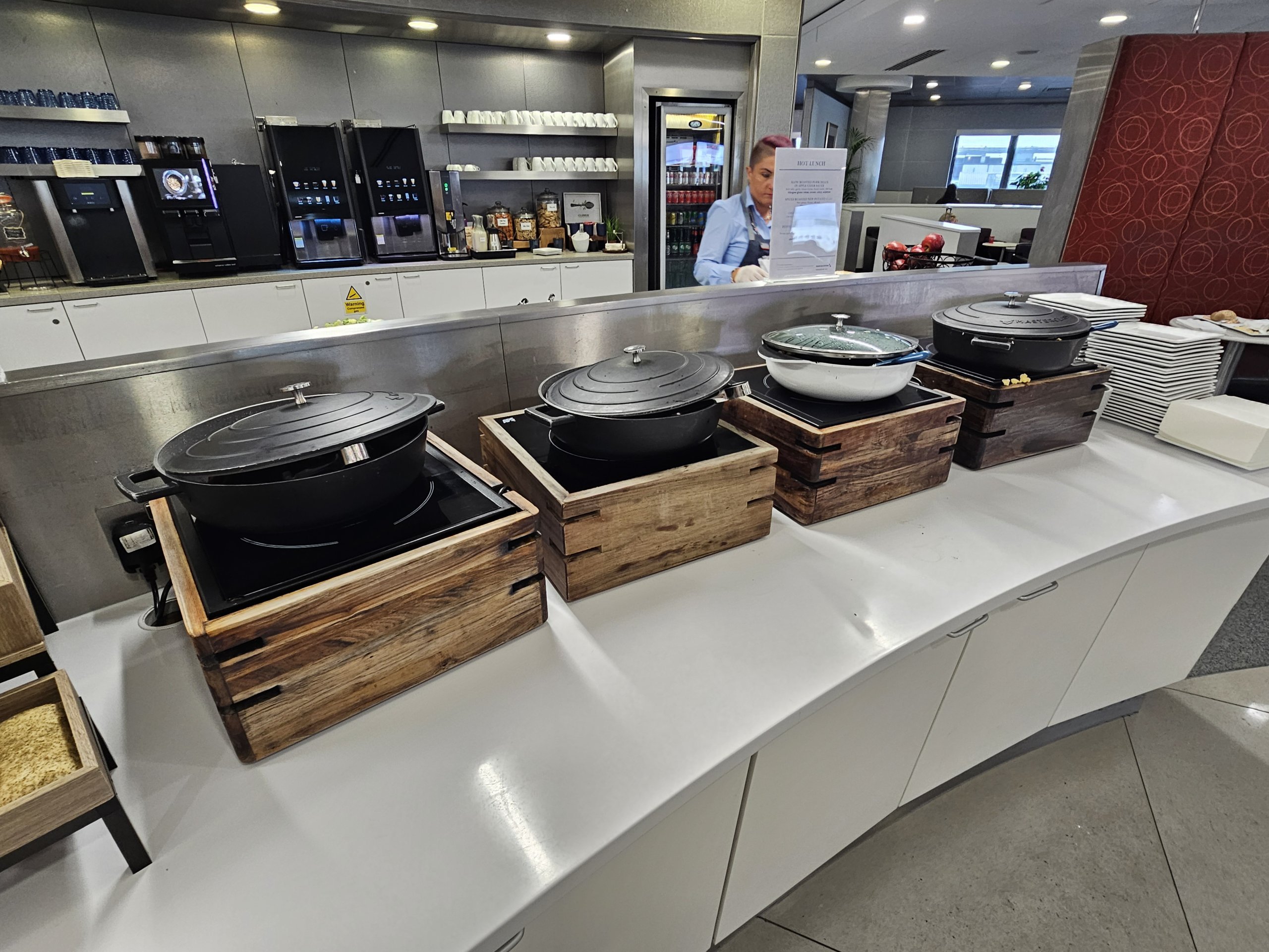 Il cibo caldo offre un menu per la colazione (fino alle 11:30 circa) e un menu per il pranzo (fino alla chiusura della lounge). La zuppa è disponibile tutto il giorno.