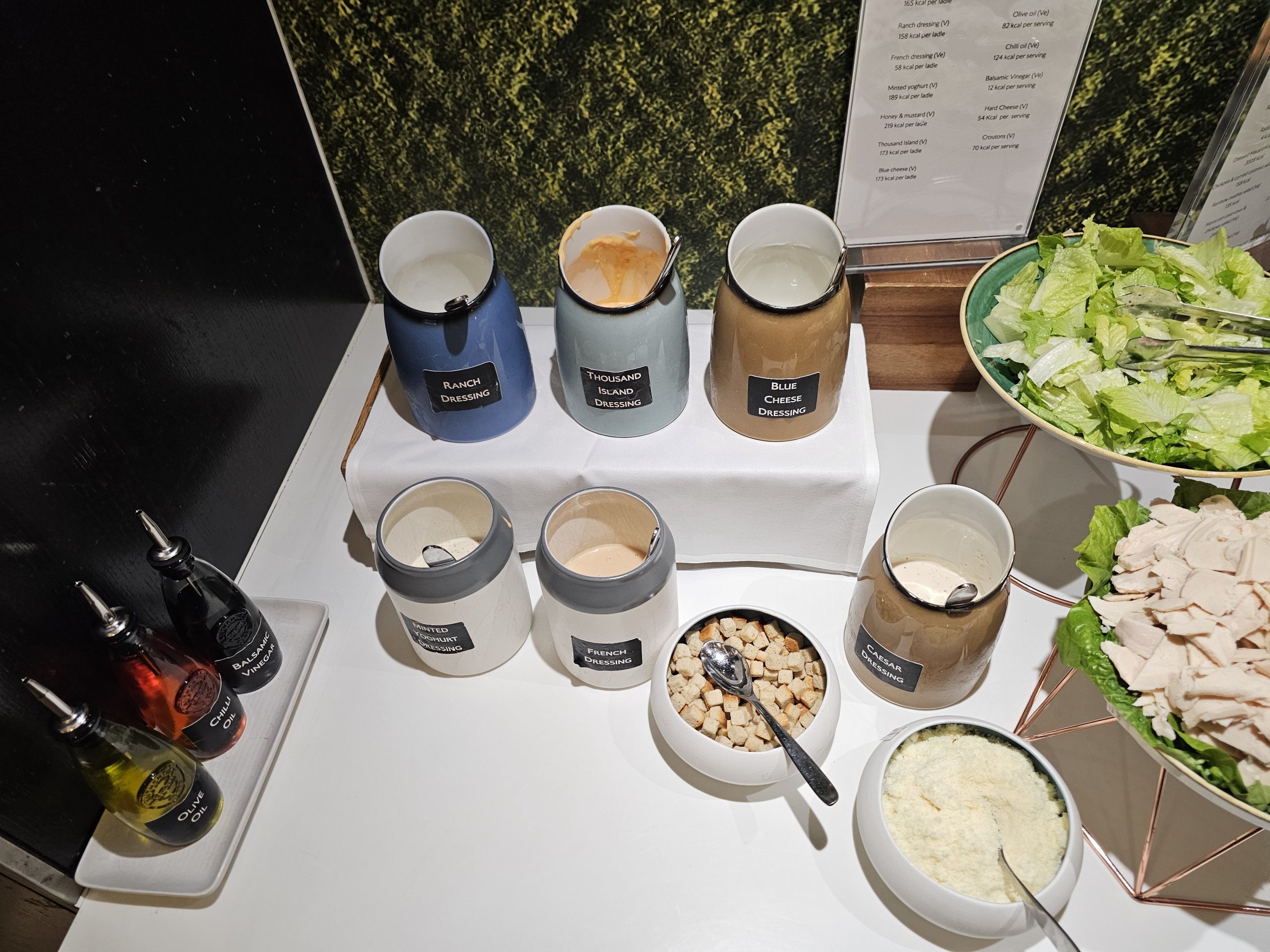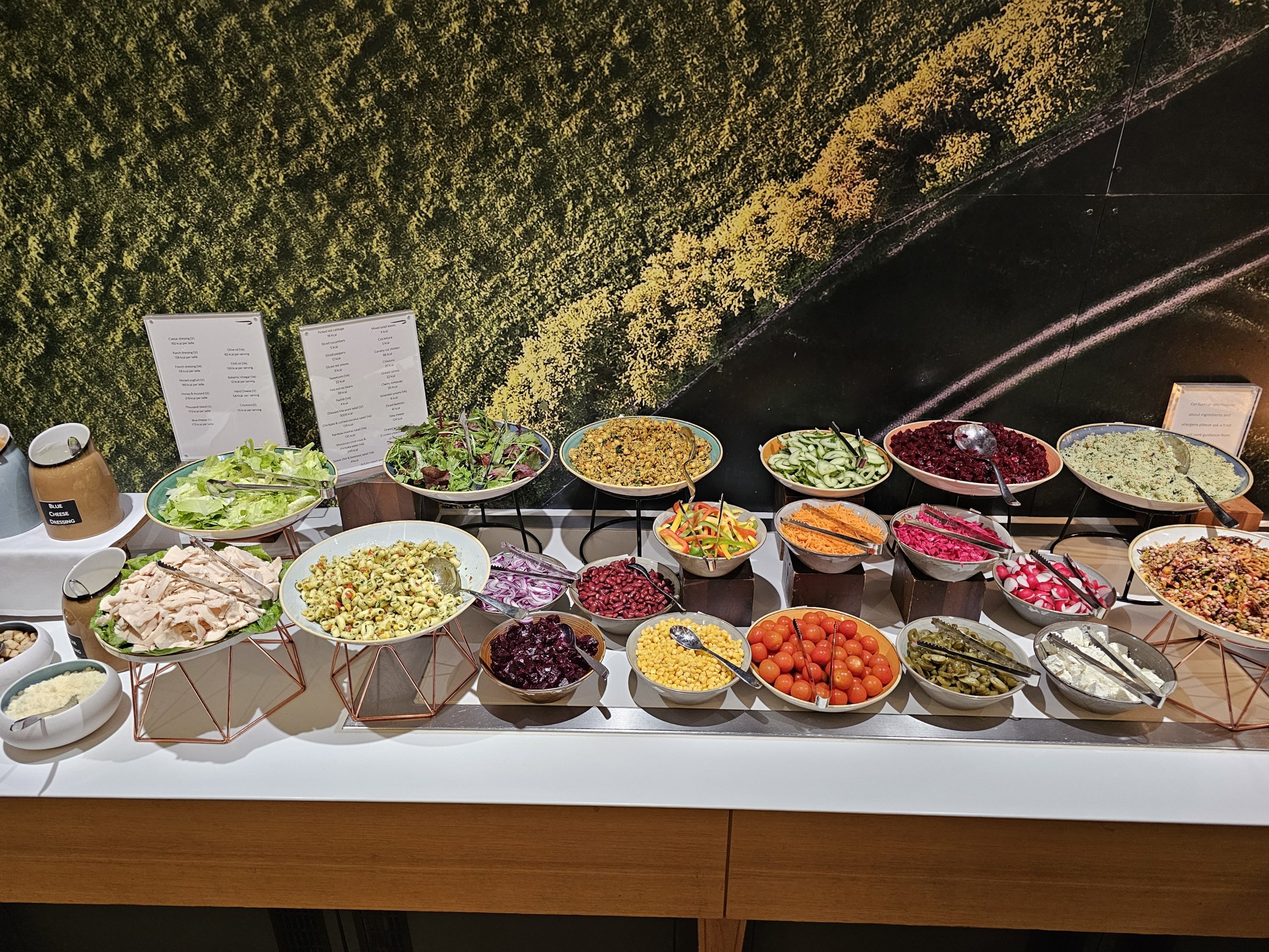 Il menu dei cibi freddi comprende alcune verdure, un'insalata con una scelta di condimenti diversi e una selezione molto limitata e debole di dolci (praticamente solo dolci).