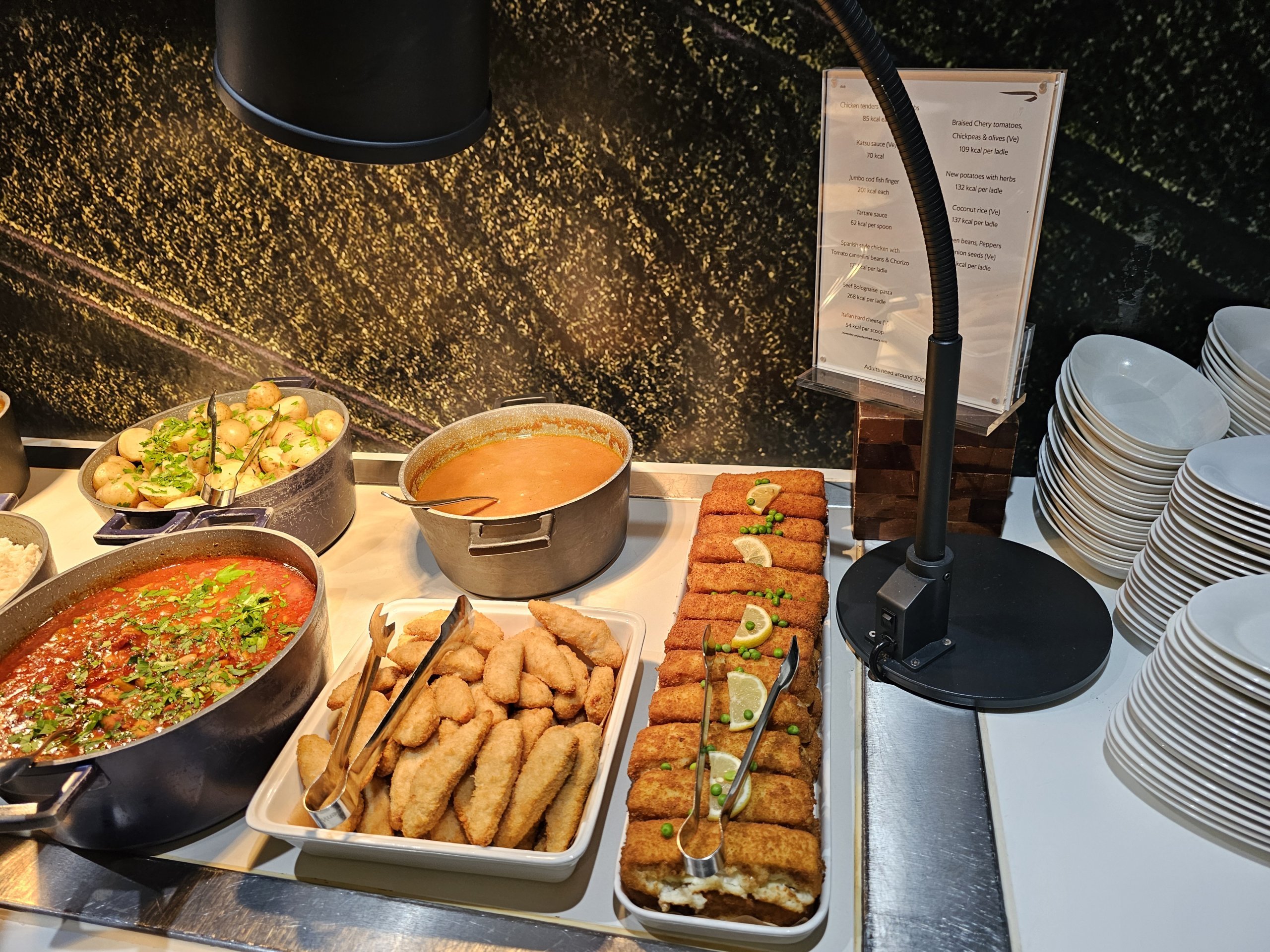 Il cibo caldo offre un menu per la colazione (fino alle 11:30 circa) e un menu per il pranzo (fino alla chiusura della lounge). La zuppa è disponibile tutto il giorno.