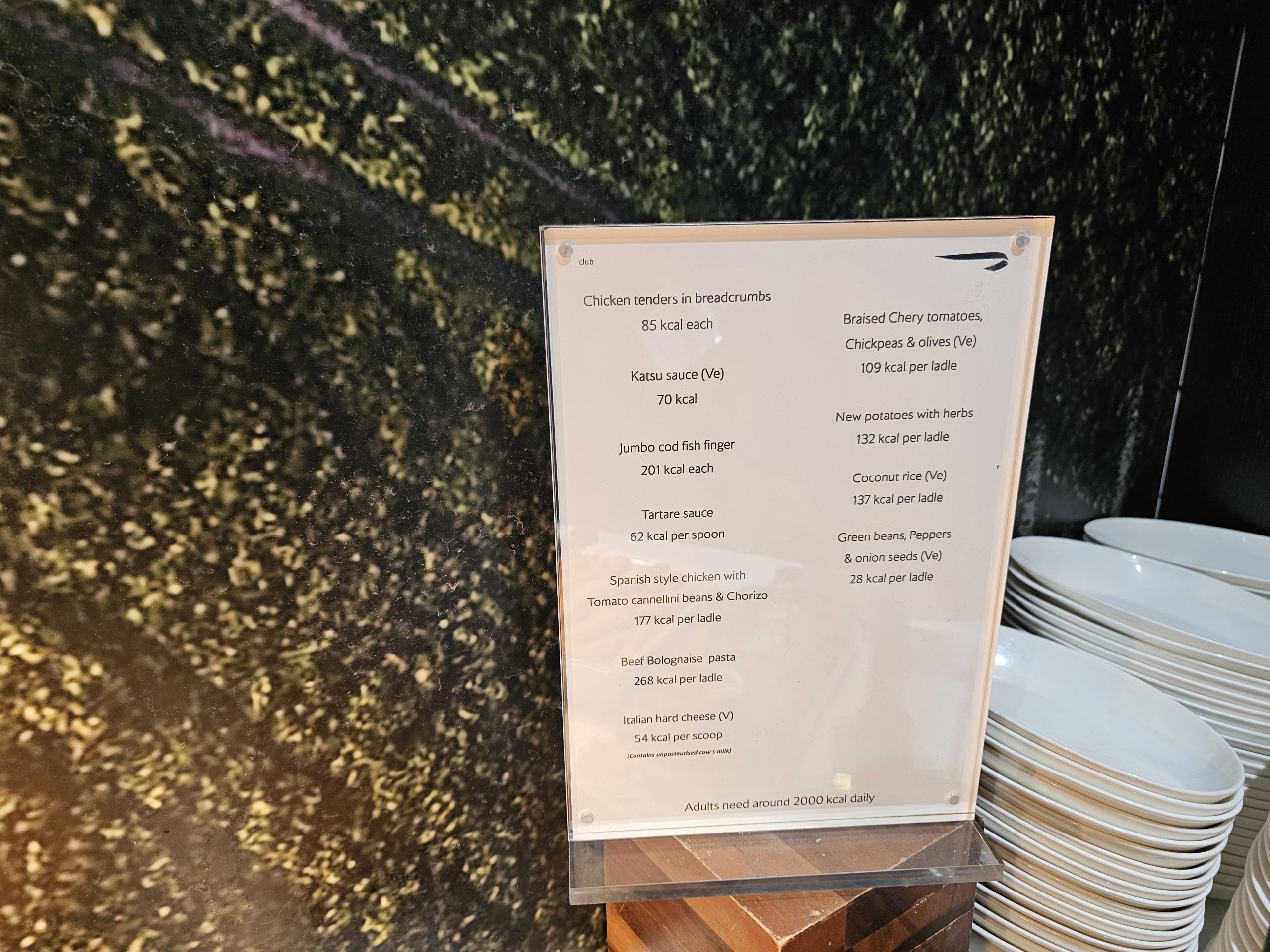 Una nota positiva è che c'è un cartello con il contenuto calorico di tutti i cibi offerti.