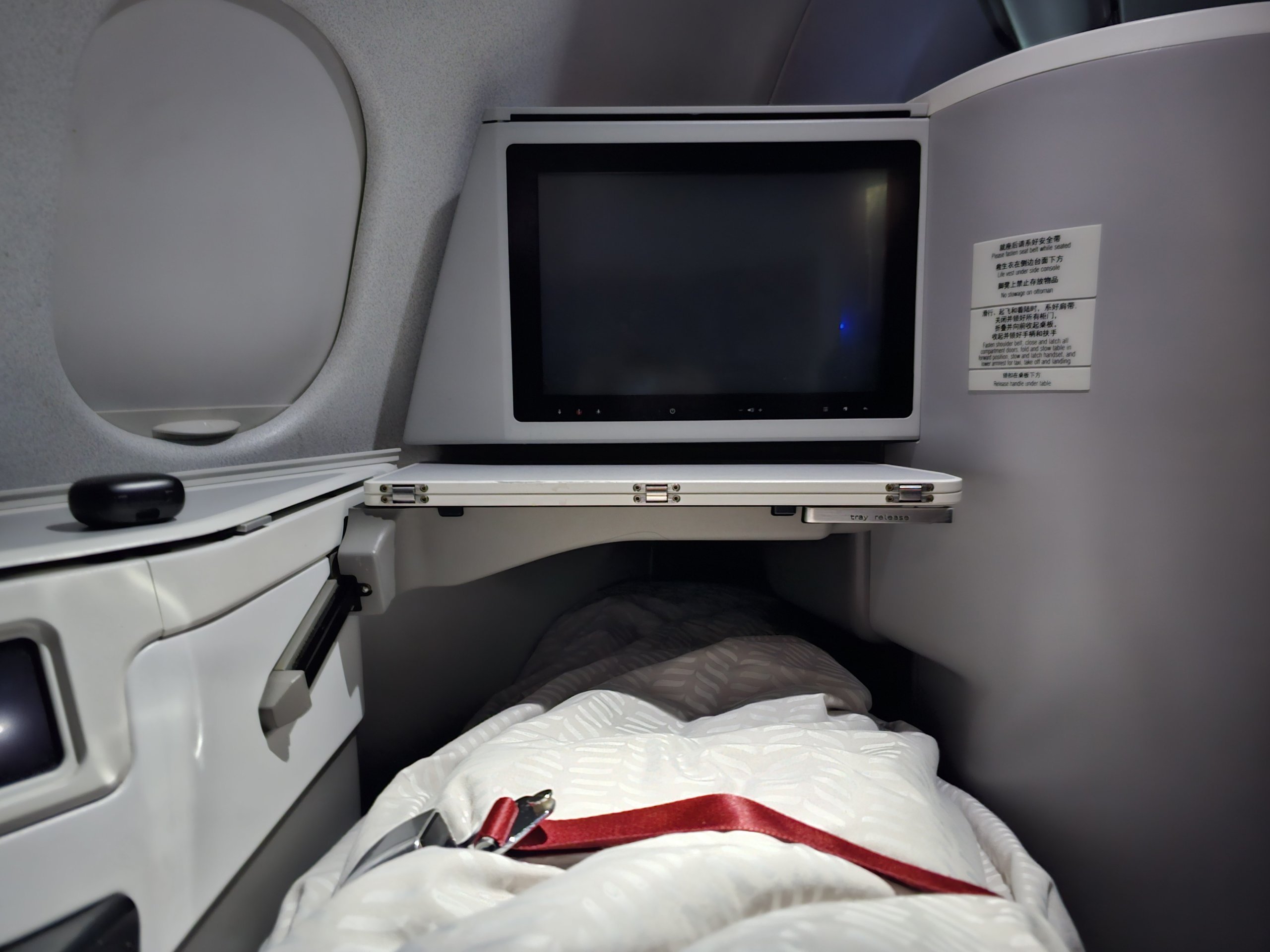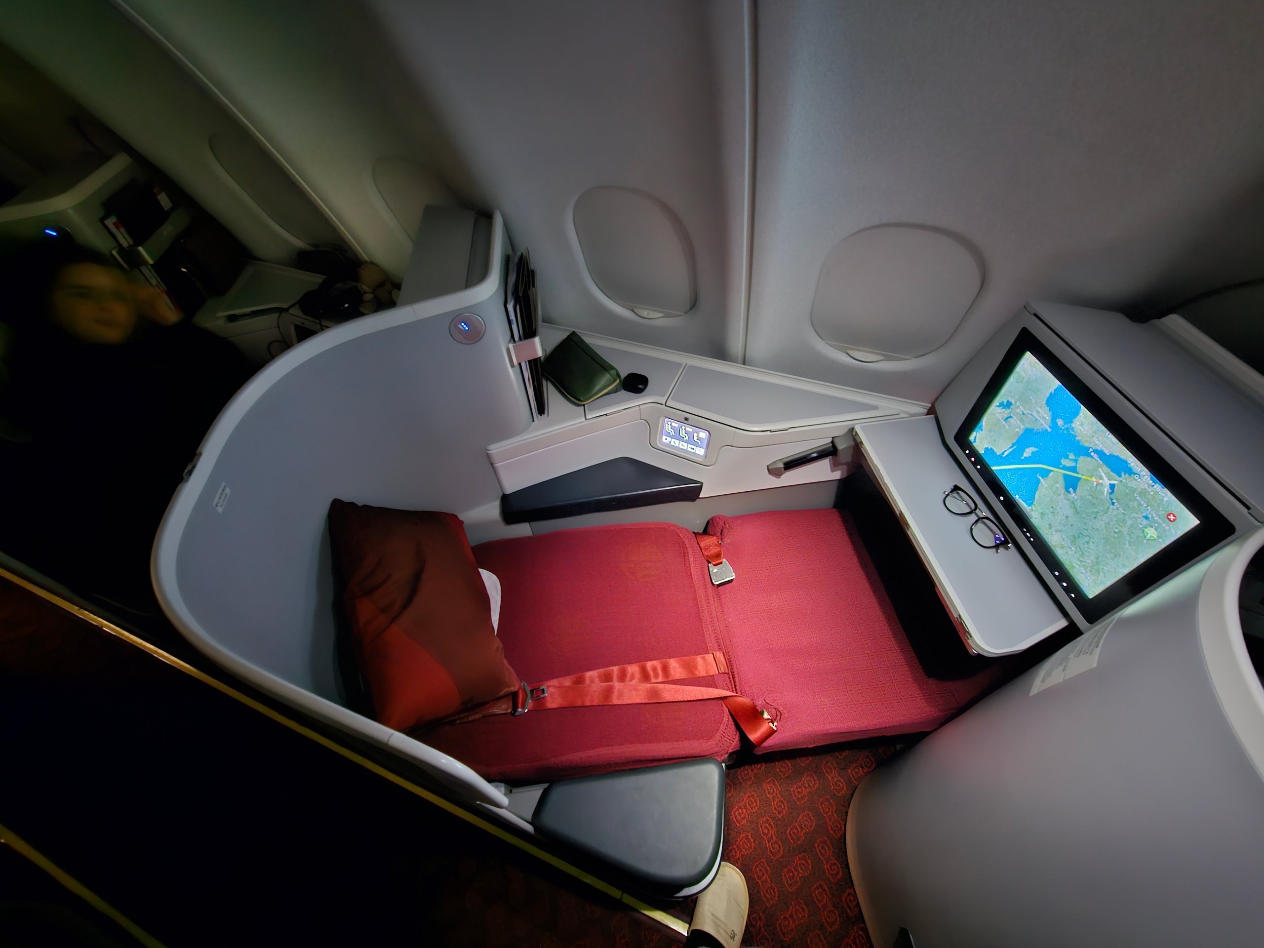 Non c'è molto spazio per le gambe quando ci si sdraia, ma la larghezza dei sedili e la separazione dei corridoi sono adeguate. Da questo punto di vista, la privacy va bene. Da sdraiato non vedo praticamente nessun passeggero.