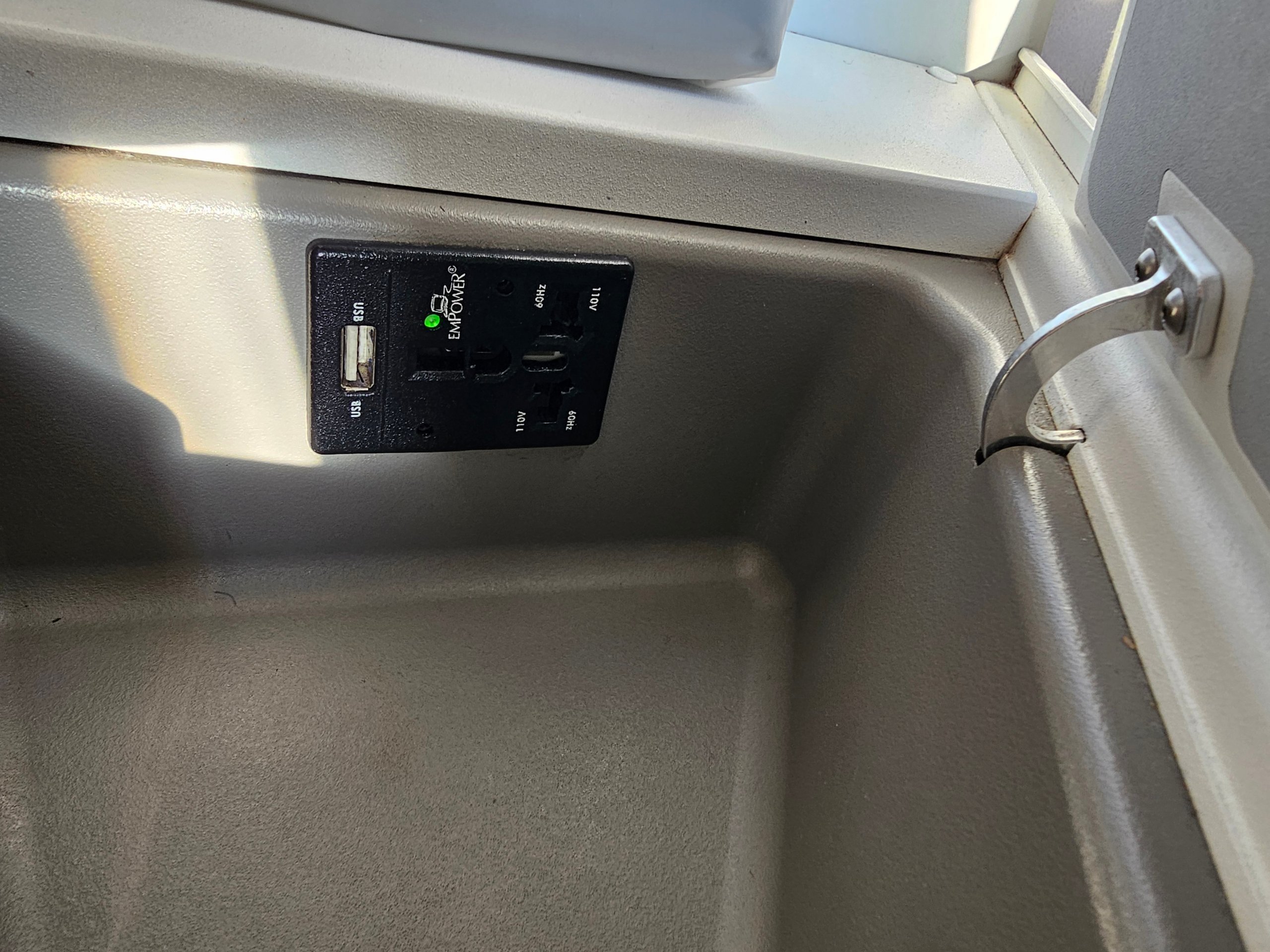 I comandi del sedile sono semplici, grazie al vecchio ma funzionale touchscreen sulla sinistra. C'è anche una piccola lampada da lettura e una presa di corrente universale con una porta USB-A.