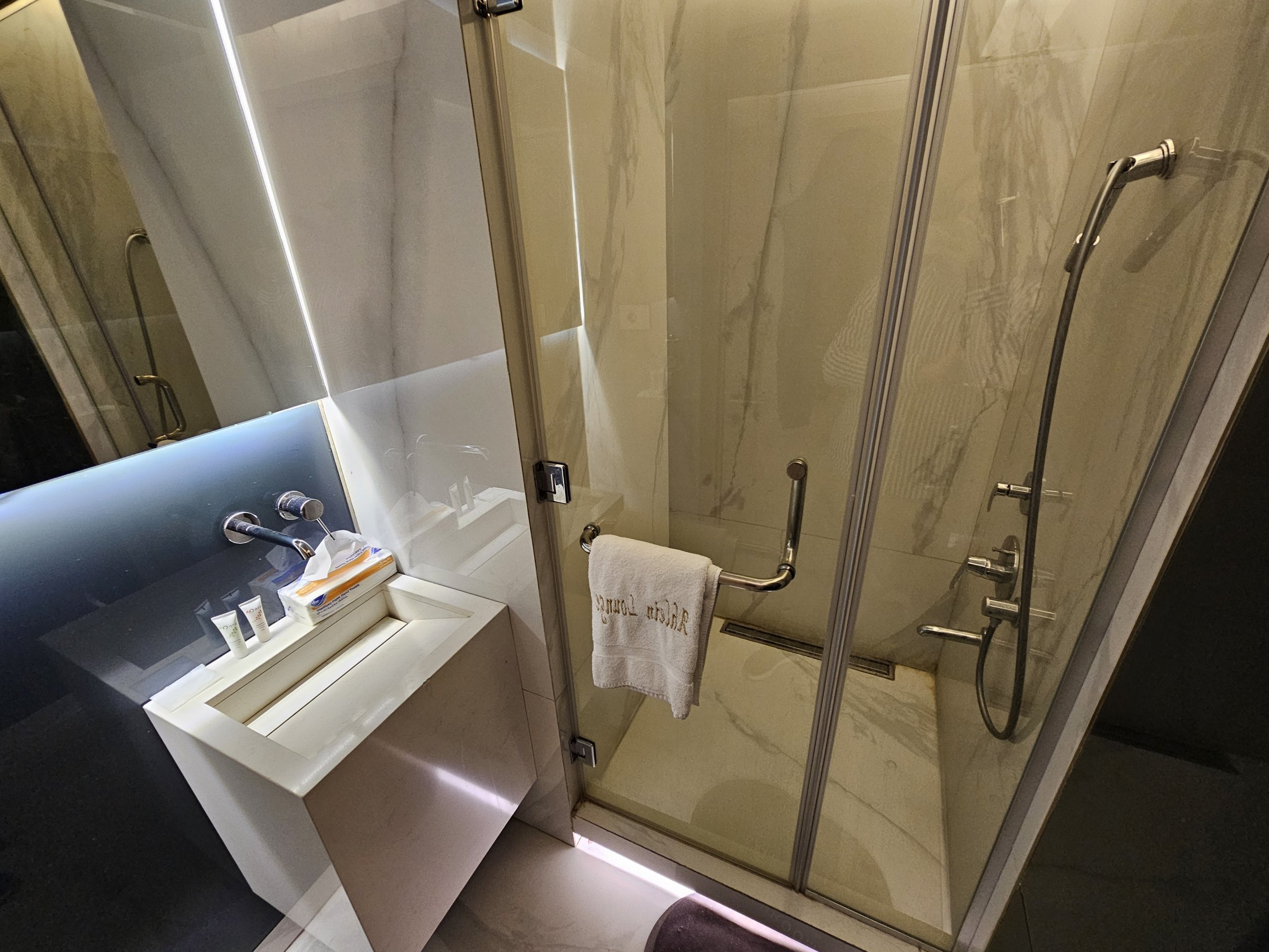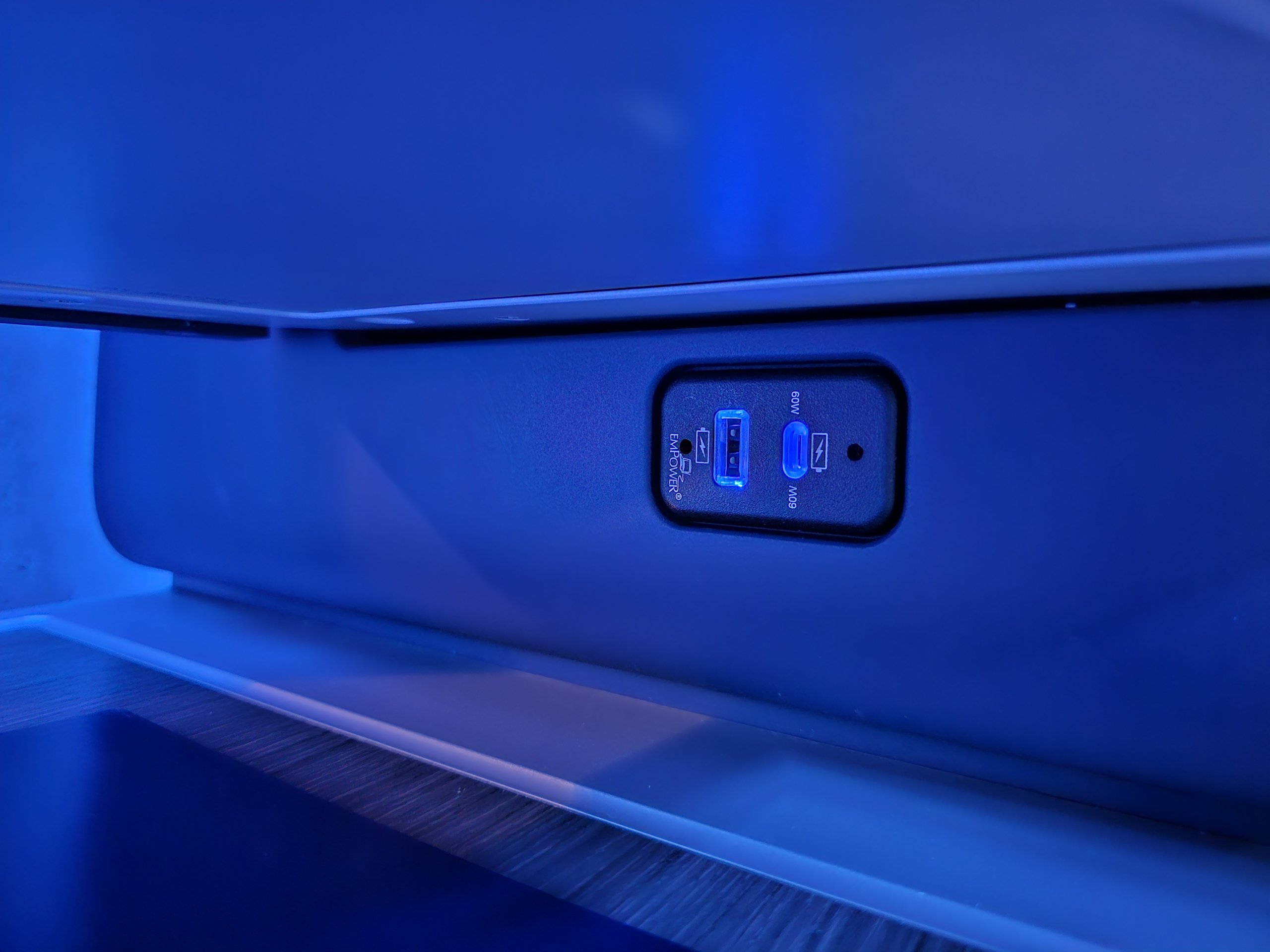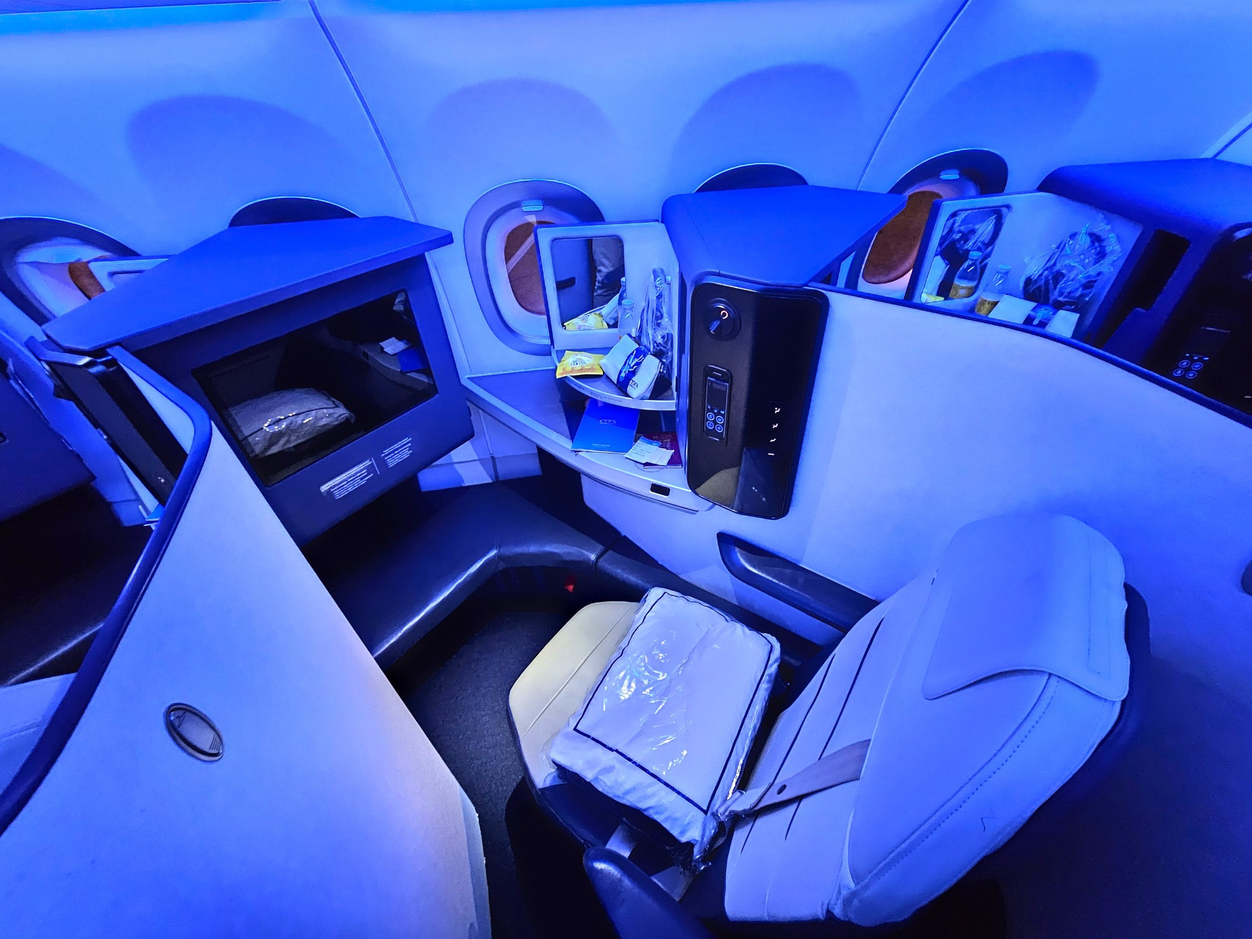 L'atmosfera elegante è accentuata dall'illuminazione notturna blu, mentre il nostro volo parte alle 4:35 del mattino.
