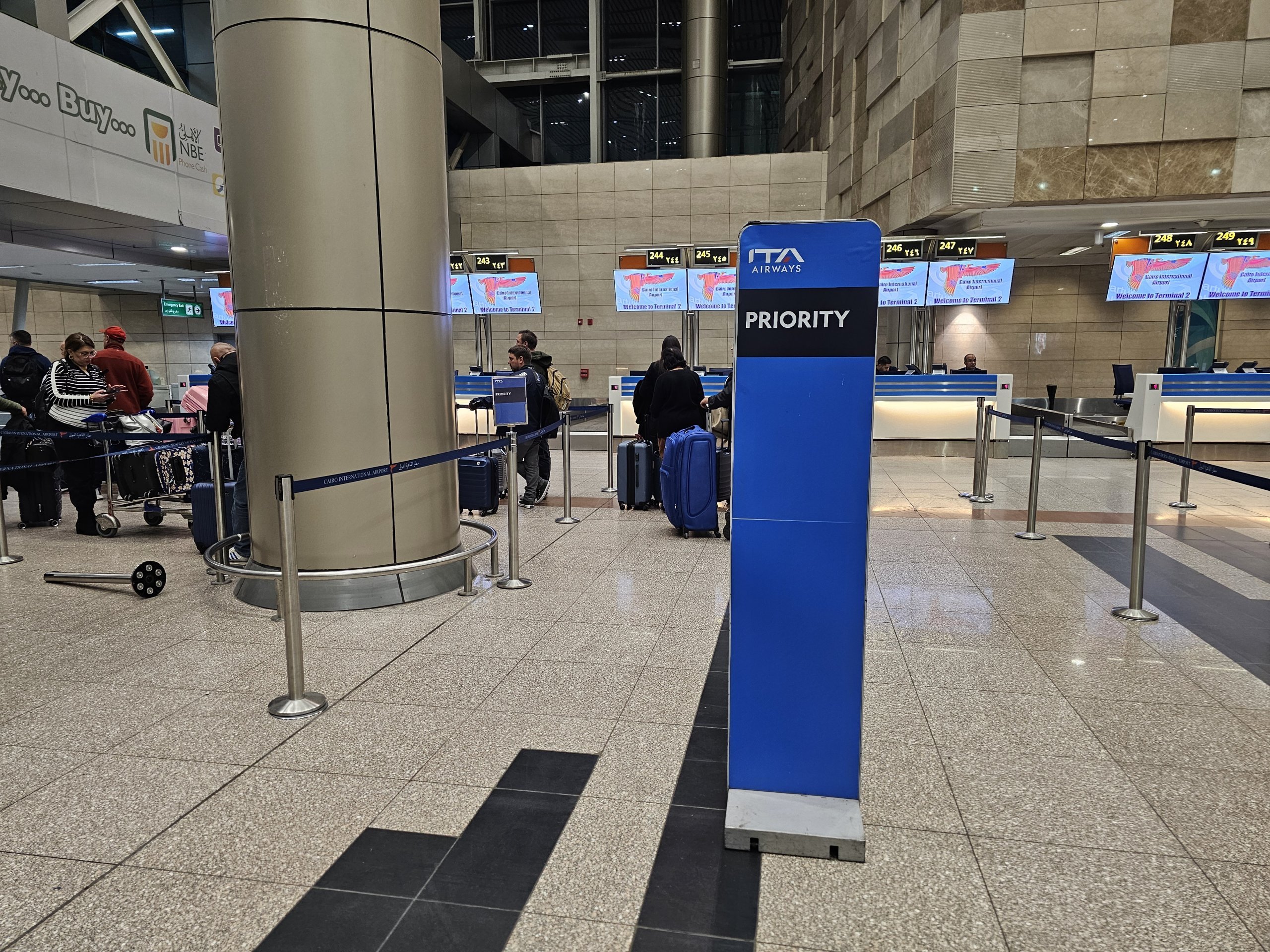 Effettuo il check-in all'aeroporto del Cairo, dove ITA Airways dispone di 5 banchi check-in dedicati nel Terminal 2. Il check-in apre circa 3 ore prima della partenza e ci sono 2 banchi prioritari per i passeggeri di classe business.