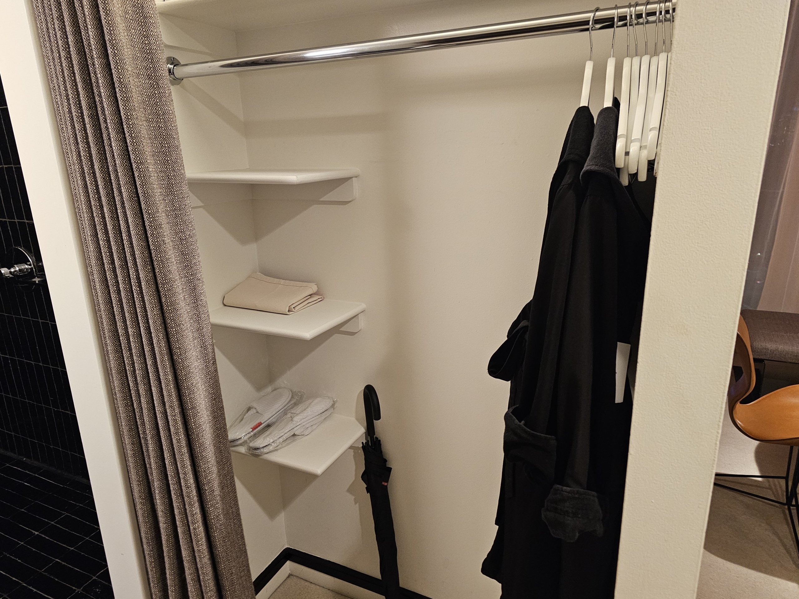 C'è pochissimo spazio per riporre le cose, praticamente solo una scrivania con un divano e un "armadio" dietro una tenda con diversi appendini. Per il resto, niente.