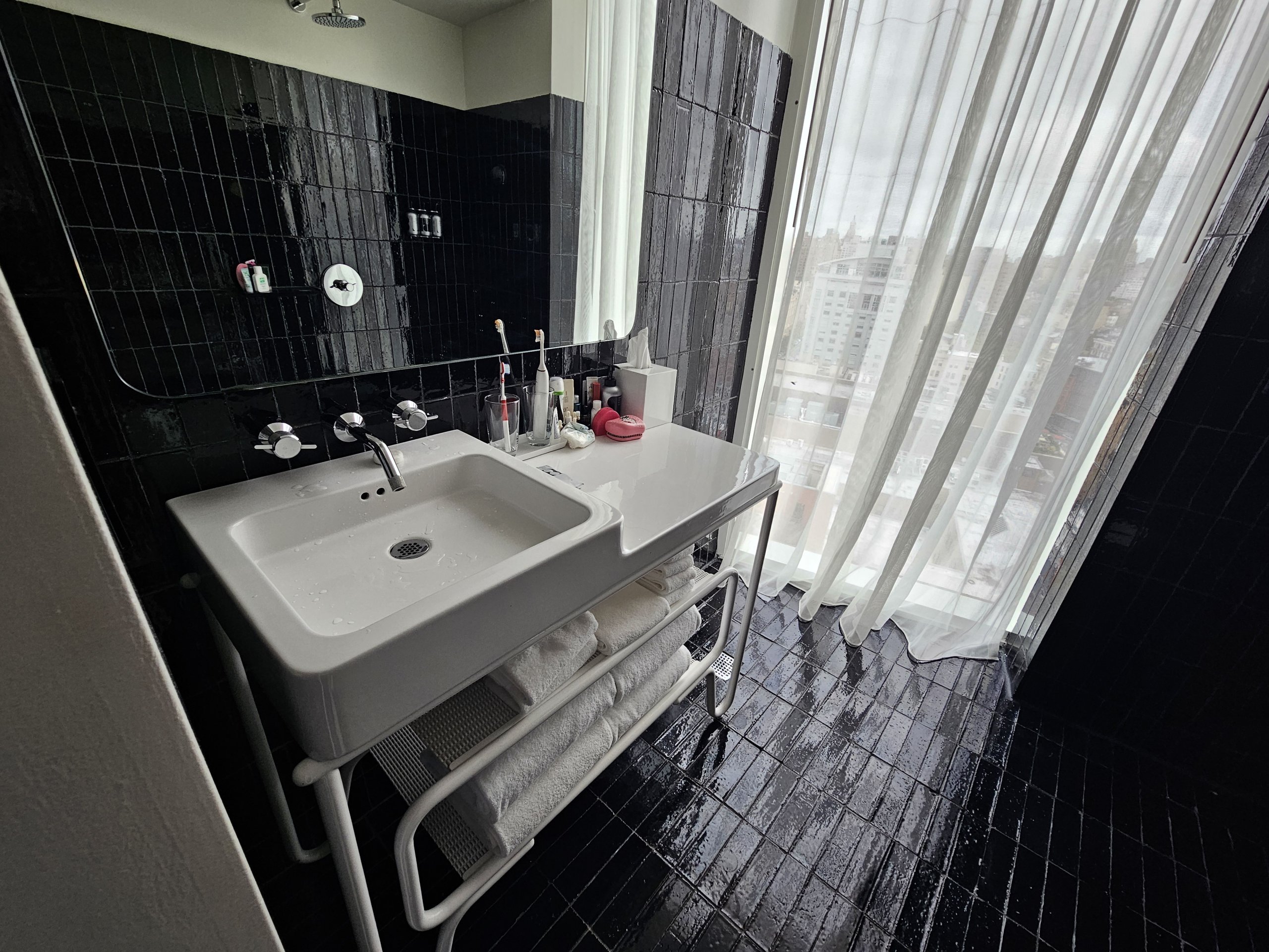 Ma la parte meno pratica della stanza per noi è sicuramente il bagno. Dal punto di vista del design, sembra abbastanza interessante, ma manca completamente la separazione tra il bagno e il resto della stanza: non c'è né una porta né una tenda.