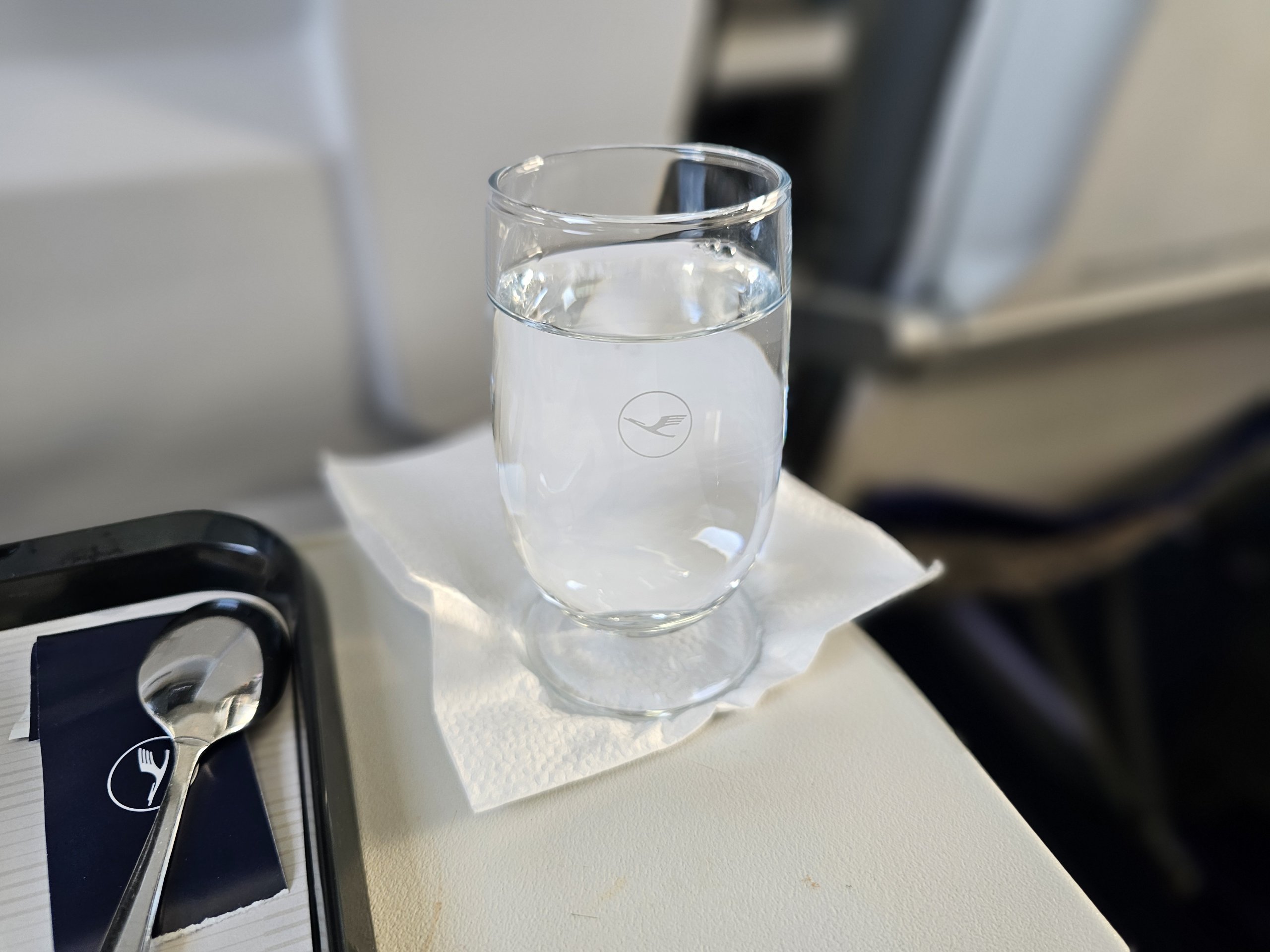 Il drink di benvenuto è ancora standard, con la possibilità di scegliere tra champagne, succhi di frutta analcolici, cocktail firmato Avionic o acqua. Per questo volo, opto per la sola acqua.