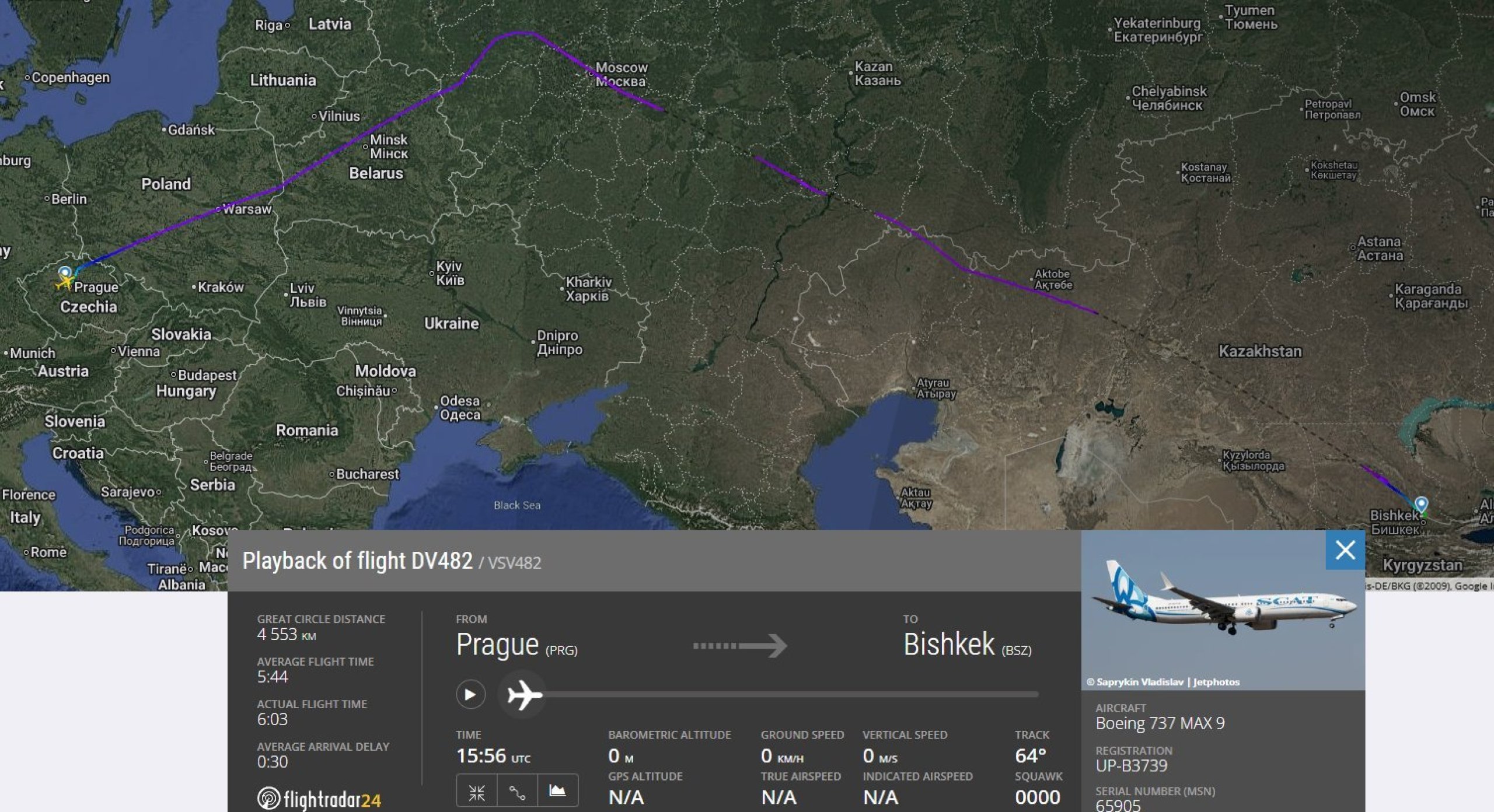 Dato che voliamo su un Boeing 737 a fusoliera stretta, non è realistico percorrere questa distanza con un solo rifornimento. Per questo motivo è stato effettuato uno scalo tecnico in Kirghizistan per fare rifornimento. La sosta dura meno di un'ora e i passeggeri rimangono a bordo dell'aereo per tutto il tempo.