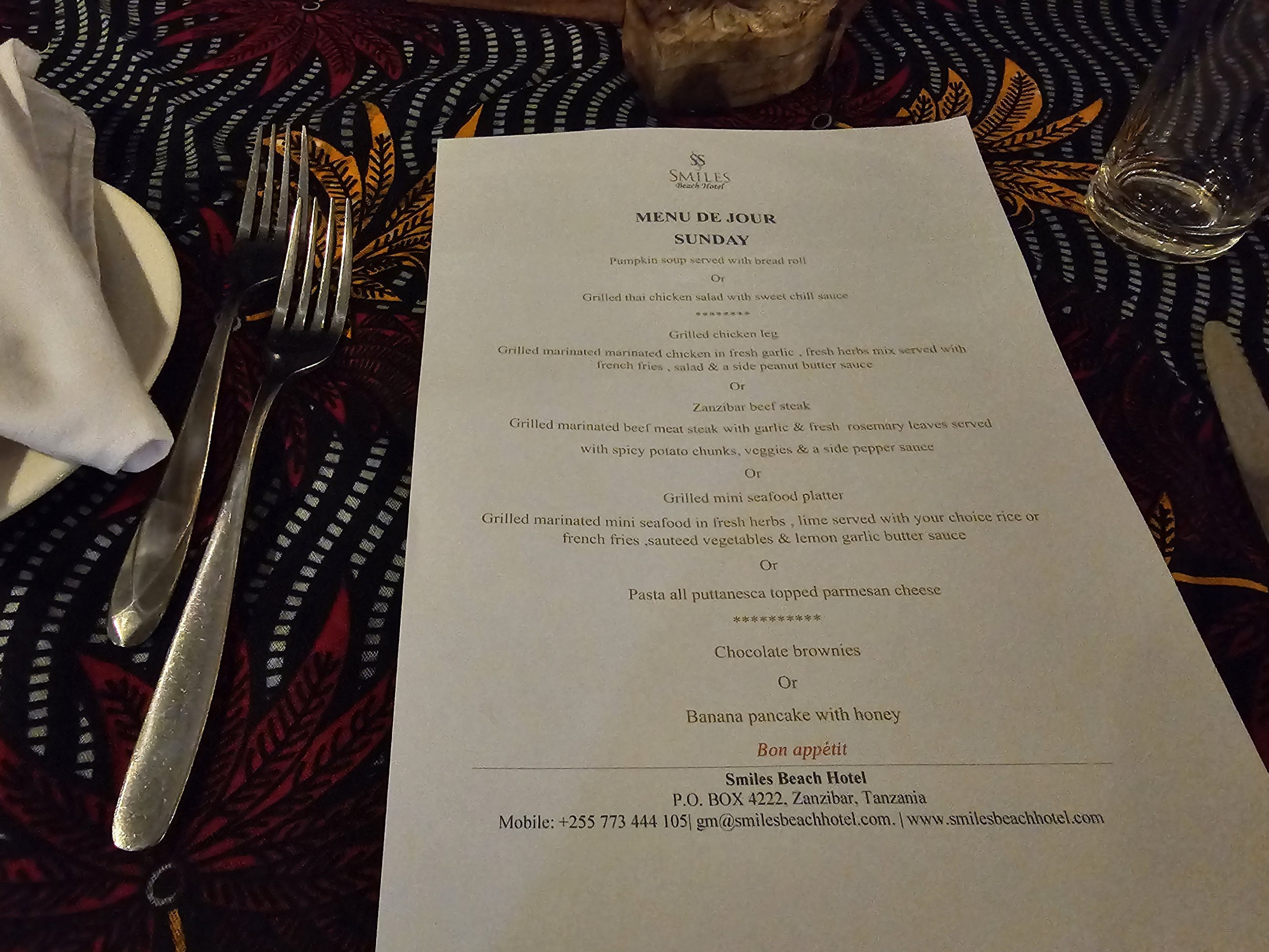 A prima vista, il menu è molto povero, ma rispetto ad altri hotel della stessa categoria a Zanzibar, come il Sea View Lodge di Jambiani, dove mi sono trasferito da Nungwi, è in realtà superiore alla media.