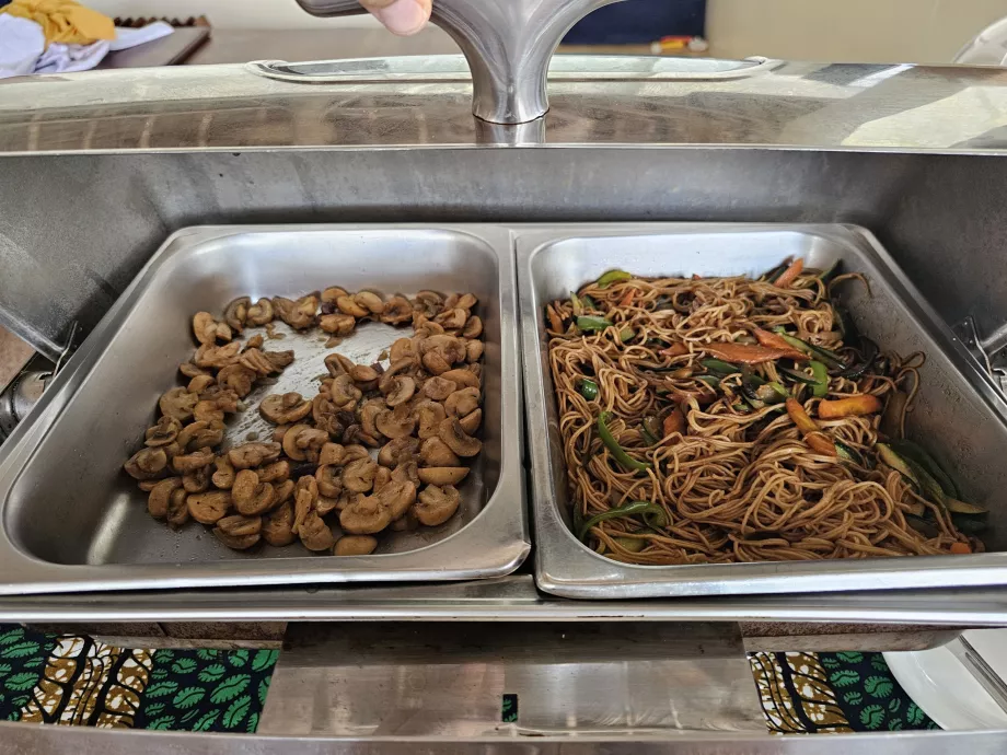 Ci sono tre tipi di cibo caldo tra cui scegliere: per lo più noodles o riso, salsicce di qualità molto scadente, frittelle chapati o altri dolci locali, verdure cotte, fagioli o funghi.