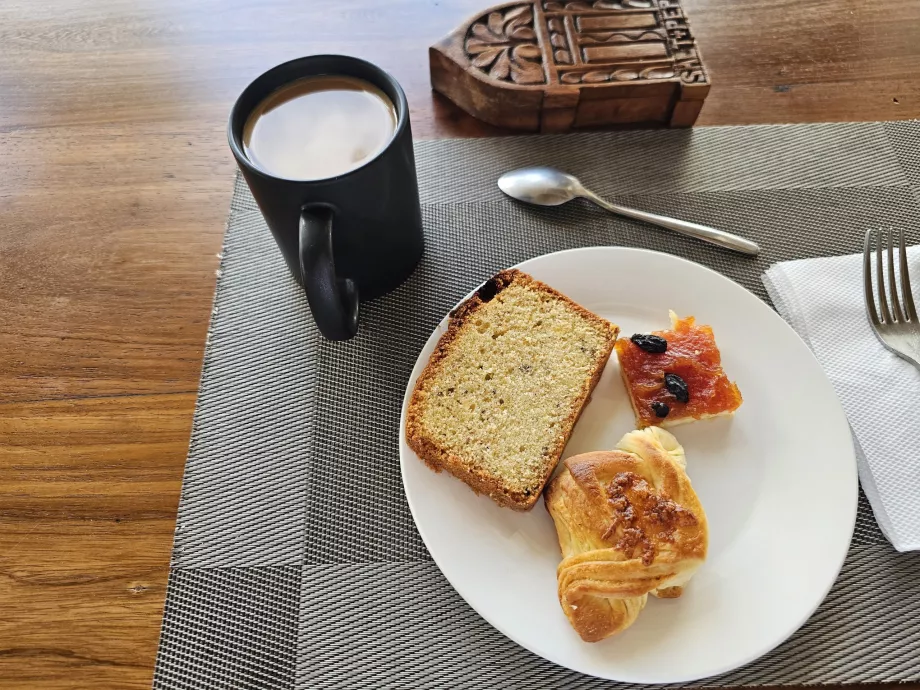 Altre offerte includono yogurt, due o tre tipi di frutta, dolci, pane tostato e sempre due tipi di succo di frutta + acqua.