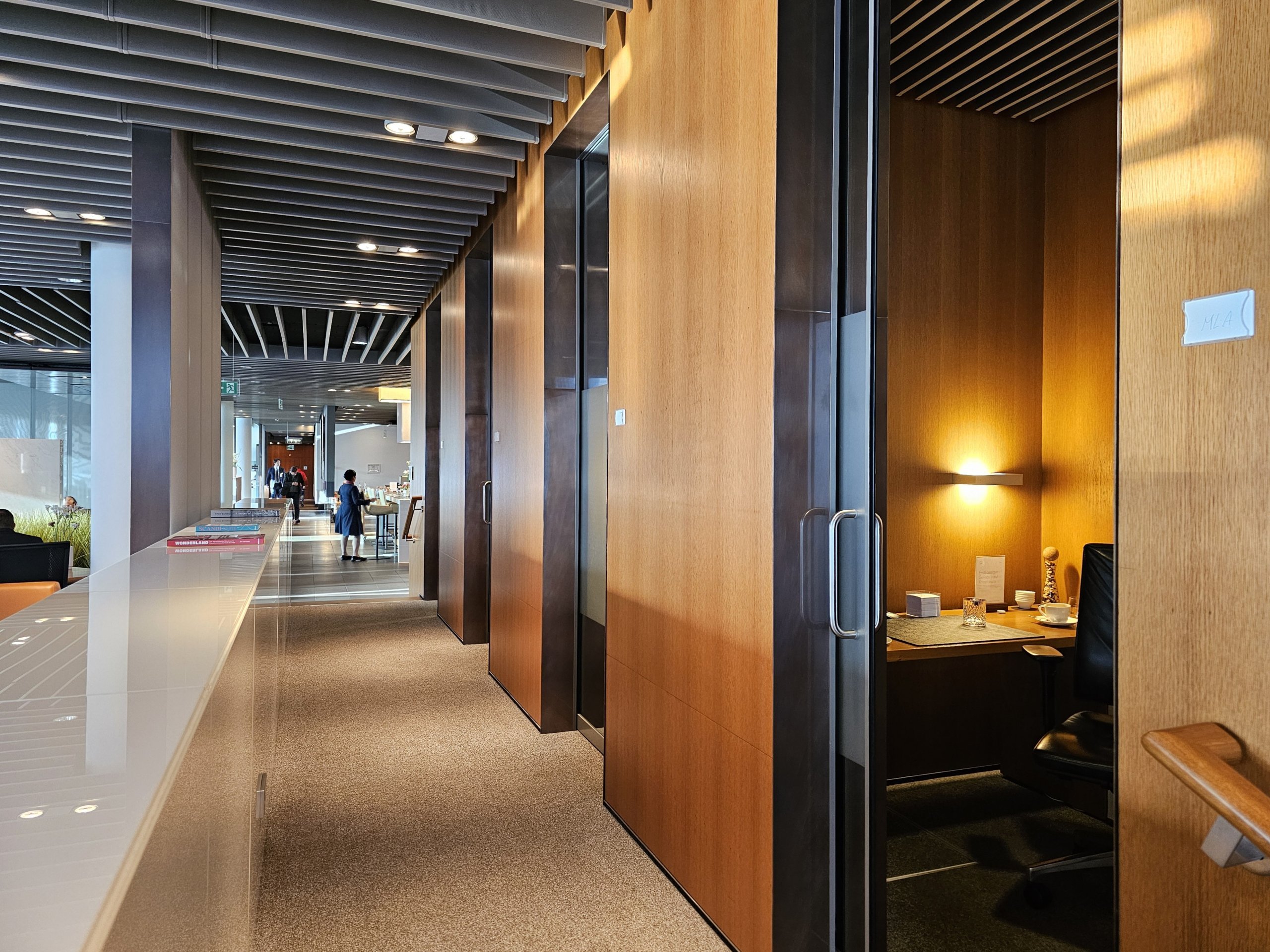 A sinistra dell'ingresso della lounge, invece, si trovano diverse cabine chiuse a chiave, ideali per lavorare al computer portatile.
