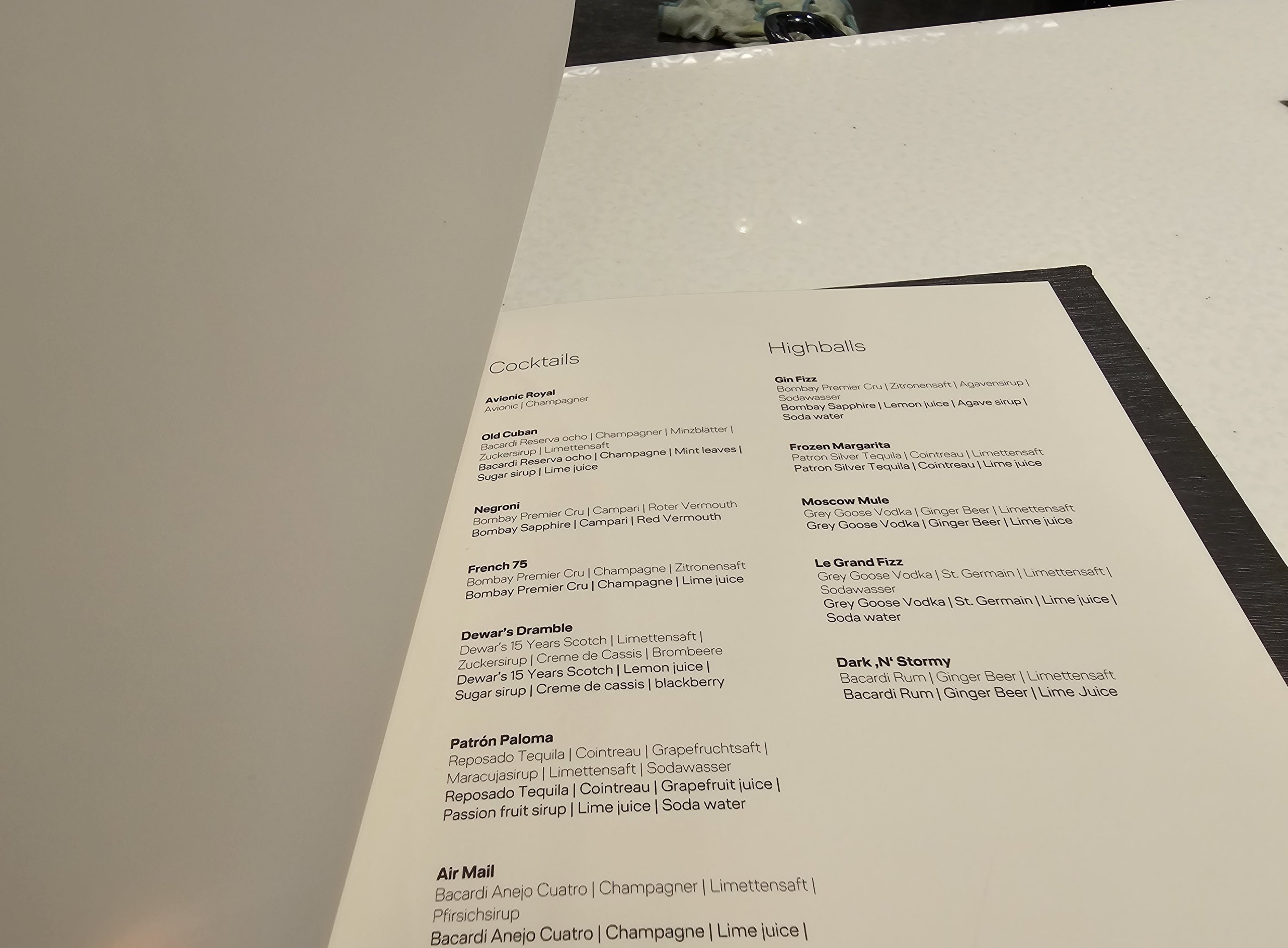 Salto l'antipasto e prendo una bistecca di manzo come piatto principale, insieme a un classico, il cocktail firmato Lufthansa chiamato Avionic.