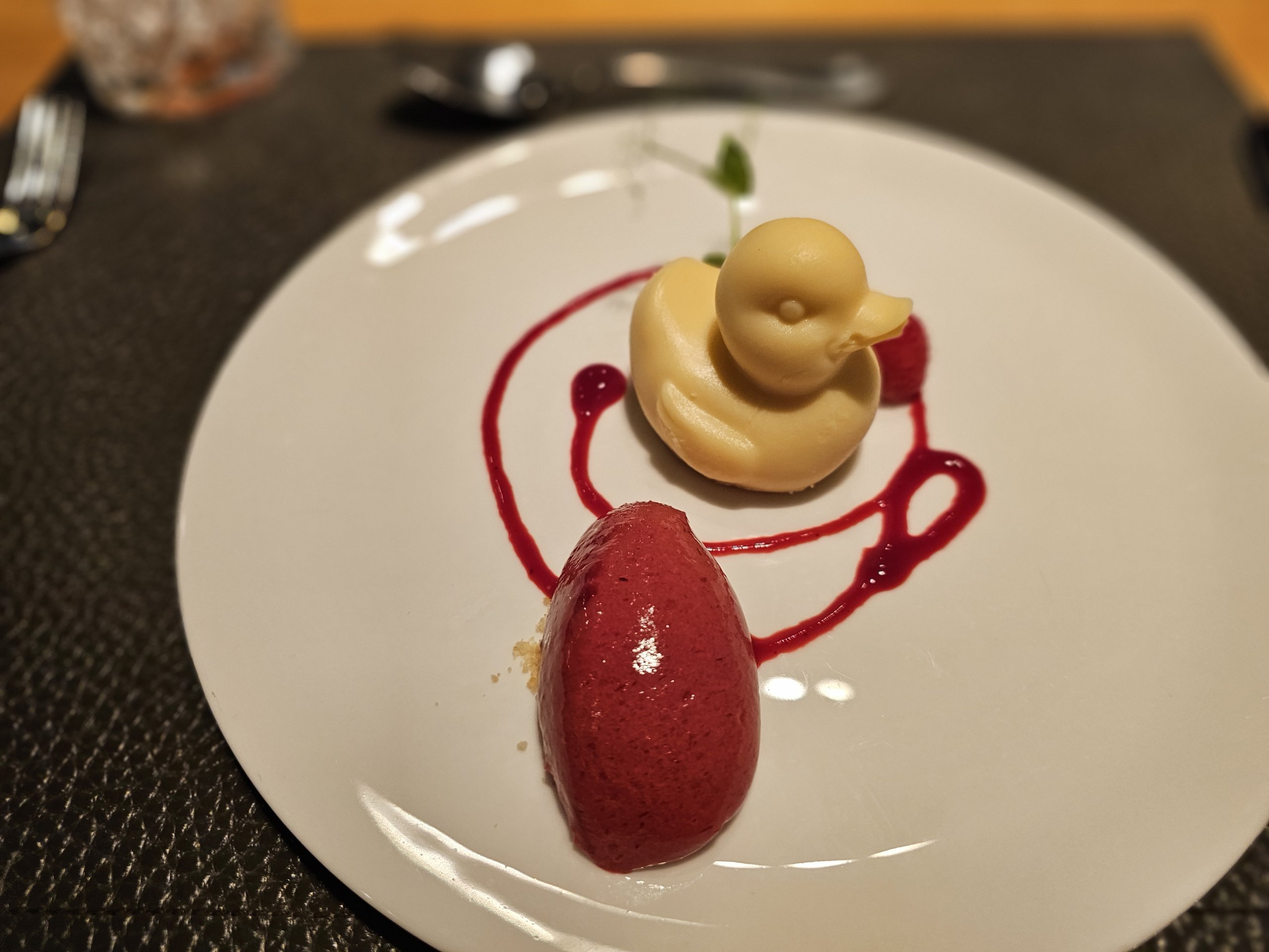 Per il dessert non posso che scegliere l'anatra al cioccolato al latte con gelato al lampone. Ora che ho iniziato a collezionare le anatre di plastica, che sono diverse in ogni lounge di Prima Classe Lufthansa, devo provare l'anatra al cioccolato!