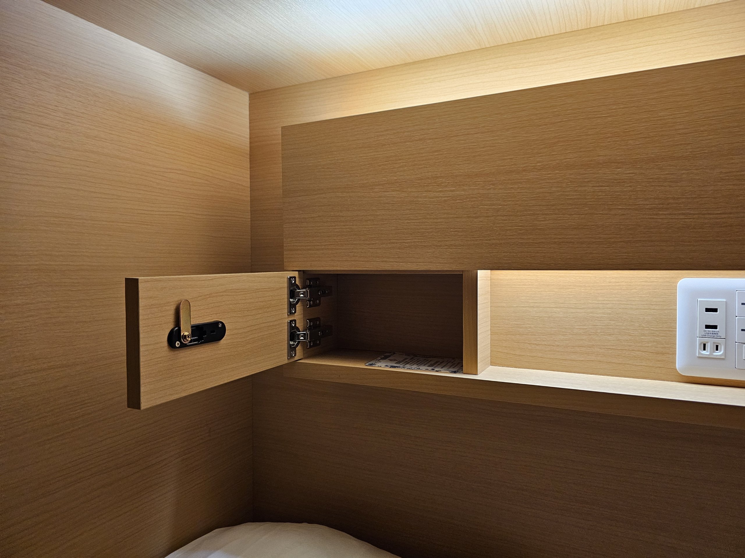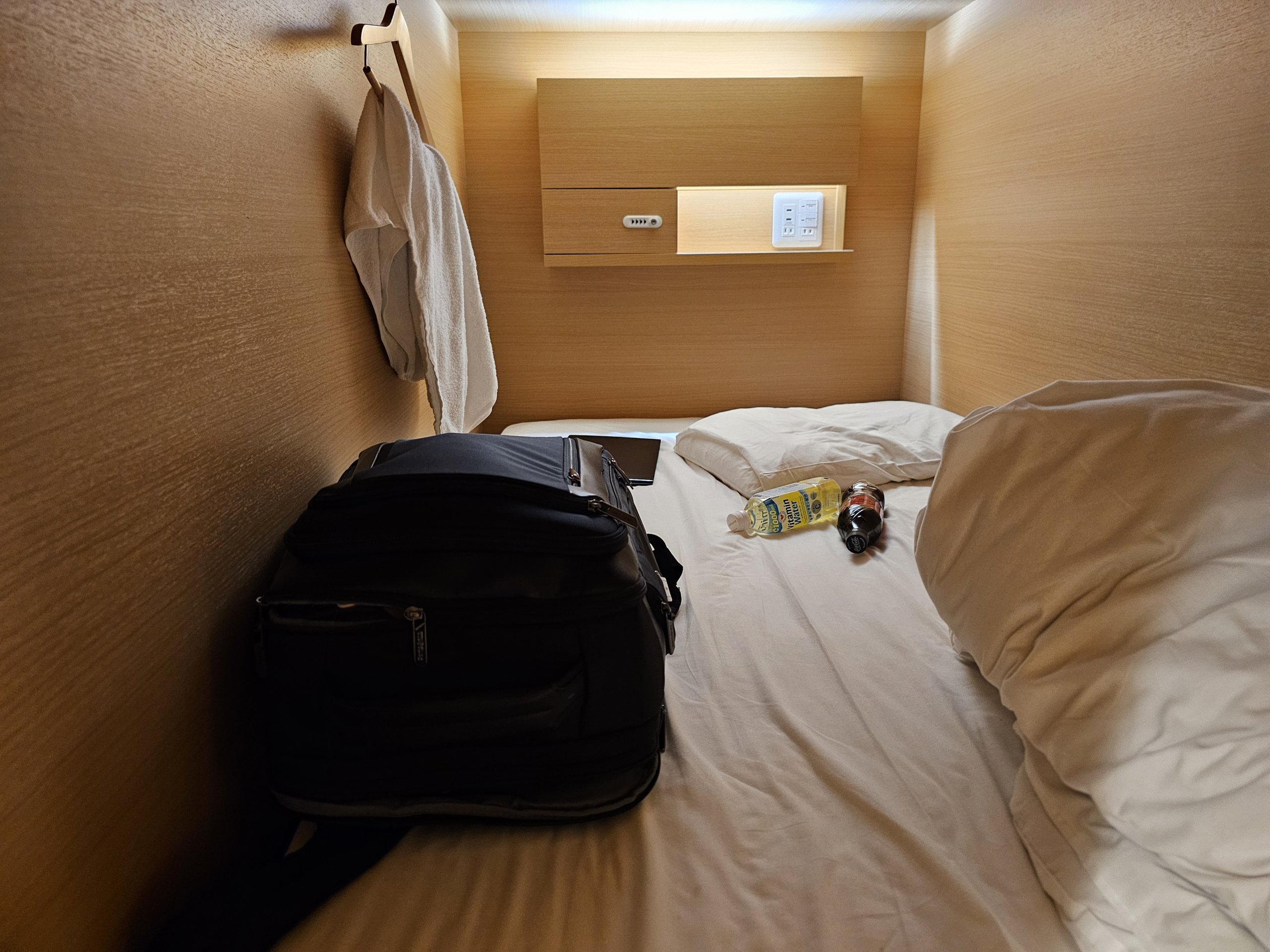 Sebbene non ci sia spazio per riporre gli oggetti nella capsula, poiché il materasso è relativamente largo, finisco per tenere lo zaino e due bottiglie di bevande accanto a me.